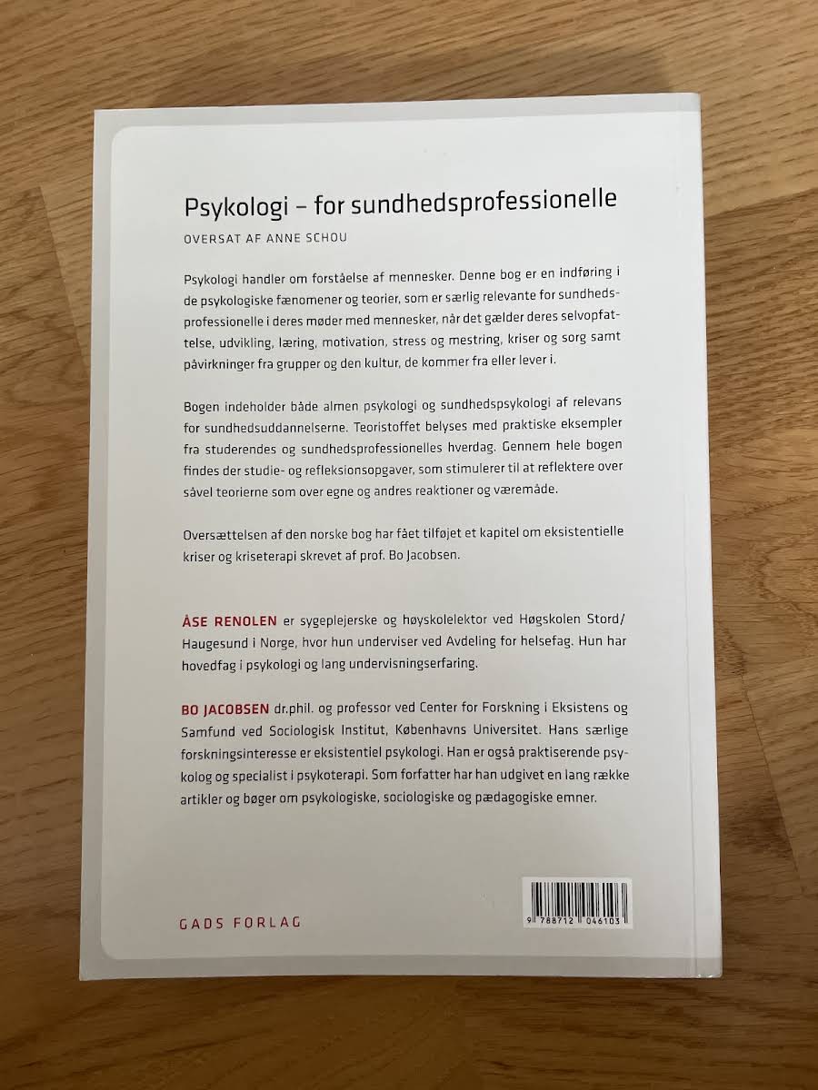Psykologi – for sundhedsprofessionelle er en grundlæggende indføring i de psykologiske teorier og fænomener, der er centrale for arbejdet inden for sundhedssektoren. Bogen, skrevet af Åse Renolen og udgivet af Gad i 2011, behandler emner som selvopfattelse, motivation, stress, krisesituationer og sorg. Derudover lægges der vægt på de kulturelle faktorer og gruppedynamikker, der påvirker både patienters og sundhedsprofessionelles hverdag. Med en kombination af teoretisk stof og praktiske eksempler, tilbyder bogen et nyttigt perspektiv for både studerende og erfarne sundhedsprofessionelle. Den inspirerer til refleksion over, hvordan psykologiske processer former menneskers reaktioner og interaktioner, og giver dermed en dybere forståelse for de udfordringer, man møder i dagligdagen.