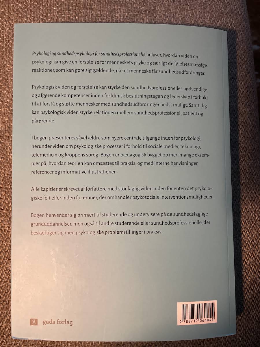 I Psykologi og sundhedspsykologi for sundhedsprofessionelle udfoldes psykologisk viden som nøglen til at forstå menneskets reaktioner i mødet med sygdom og sundhedsudfordringer. Bogen dykker ned i de følelsesmæssige processer, der aktiveres, når patientens hverdag forandres, og belyser, hvordan disse reaktioner også påvirker pårørende. Med udgangspunkt i både klassiske teorier og nyere forskning præsenteres centrale tilgange inden for psykologi, herunder sociale medier, moderne teknologi, telemedicin og kroppens ikke-verbale sprog. Konkrete eksempler viser, hvordan teorien kan omsættes til praksis, og hvordan psykologisk indsigt styrker beslutningskompetencer og relationen mellem sundhedsprofessionel, patient og pårørende. Bogen er pædagogisk opbygget med overskuelige kapitler, interne henvisninger, referencer og informative illustrationer, der sikrer let anvendelse i klinisk praksis. Hvert kapitel er forfattet af erfarne eksperter inden for psykologi og psykosociale interventioner. Den henvender sig til studerende og undervisere på sundhedsuddannelser samt til alle sundhedsprofessionelle, der møder psykologiske problemstillinger i deres arbejde.