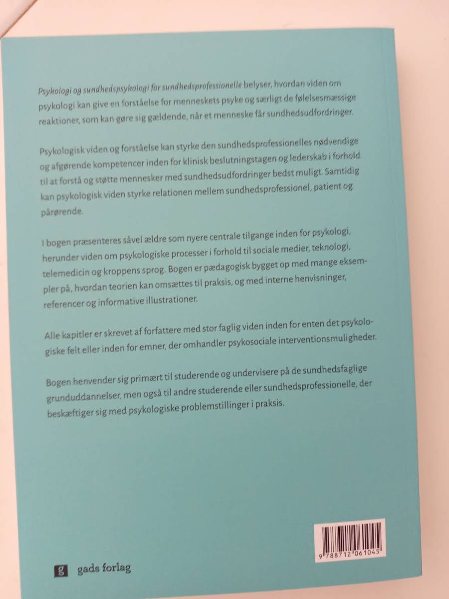 I Psykologi og sundhedspsykologi for sundhedsprofessionelle udfoldes psykologisk viden som nøglen til at forstå menneskets reaktioner i mødet med sygdom og sundhedsudfordringer. Bogen dykker ned i de følelsesmæssige processer, der aktiveres, når patientens hverdag forandres, og belyser, hvordan disse reaktioner også påvirker pårørende. Med udgangspunkt i både klassiske teorier og nyere forskning præsenteres centrale tilgange inden for psykologi, herunder sociale medier, moderne teknologi, telemedicin og kroppens ikke-verbale sprog. Konkrete eksempler viser, hvordan teorien kan omsættes til praksis, og hvordan psykologisk indsigt styrker beslutningskompetencer og relationen mellem sundhedsprofessionel, patient og pårørende. Bogen er pædagogisk opbygget med overskuelige kapitler, interne henvisninger, referencer og informative illustrationer, der sikrer let anvendelse i klinisk praksis. Hvert kapitel er forfattet af erfarne eksperter inden for psykologi og psykosociale interventioner. Den henvender sig til studerende og undervisere på sundhedsuddannelser samt til alle sundhedsprofessionelle, der møder psykologiske problemstillinger i deres arbejde.