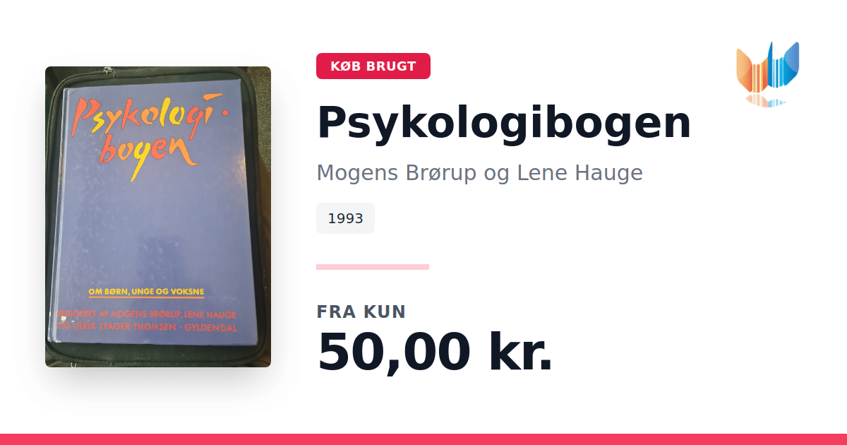Lige nu kan du købe "Psykologibogen" af Mogens Brørup og Lene Hauge til kun 50,00 kr. Bogen du ser her er brugt, og i god stand. Vi har i øjeblikket 2 eksemplarer til salg af "Psykologibogen", så husk at se de forskellige udgaver.