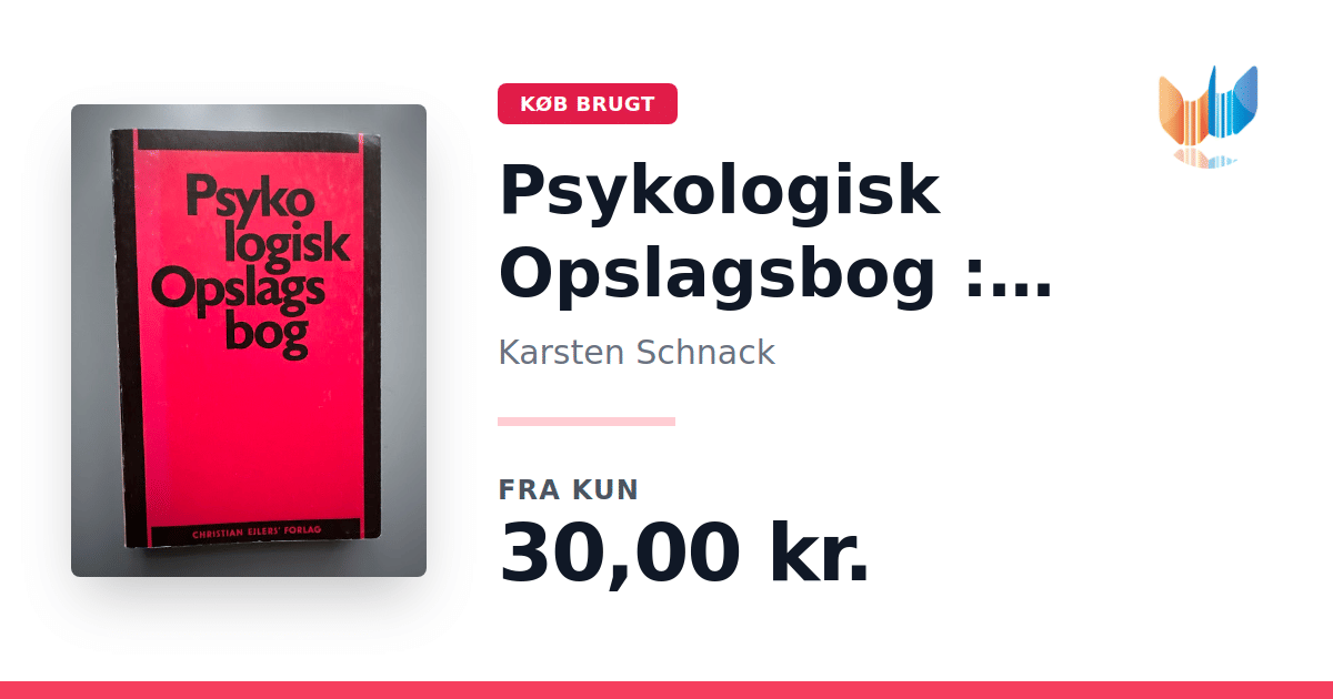 Lige nu kan du købe "Psykologisk Opslagsbog : alfabetisk ordnet" af Karsten Schnack til kun 30,00 kr. Bogen du ser her er brugt, og i god stand. Vi har i øjeblikket kun et enkelt eksemplar til salg af "Psykologisk Opslagsbog : alfabetisk ordnet", så slå til mens du kan!