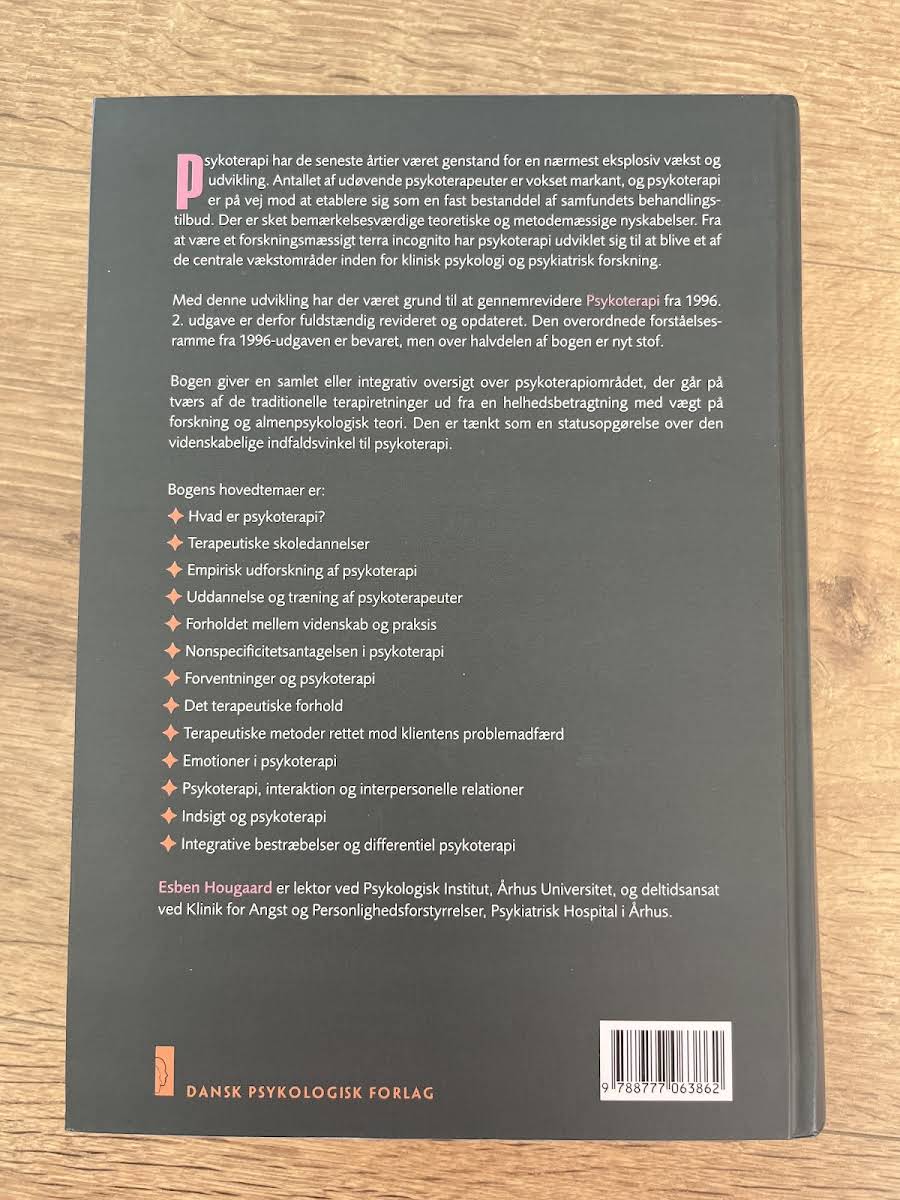 "Psykoterapi" af Esben Hougaard er en grundig og alsidig introduktion til terapifeltet, der giver et samlet overblik over de mange tilgange og teorier. Bogen er udarbejdet med udgangspunkt i både moderne forskning og almenpsykologisk teori, og den formidler viden på tværs af traditionelle terapiformer. Med en gennemrevideret tilgang skitserer forfatteren den videnskabelige fundament bag psykoterapi og stiller skarpt på den teoretiske og praktiske udvikling inden for området. Udgivet i 2004 af Dansk psykologisk Forlag, er denne 720-siders håndbog et uundværligt redskab for studerende, praktiserende og alle interesserede i at få et solidt indblik i psykoterapifaget.