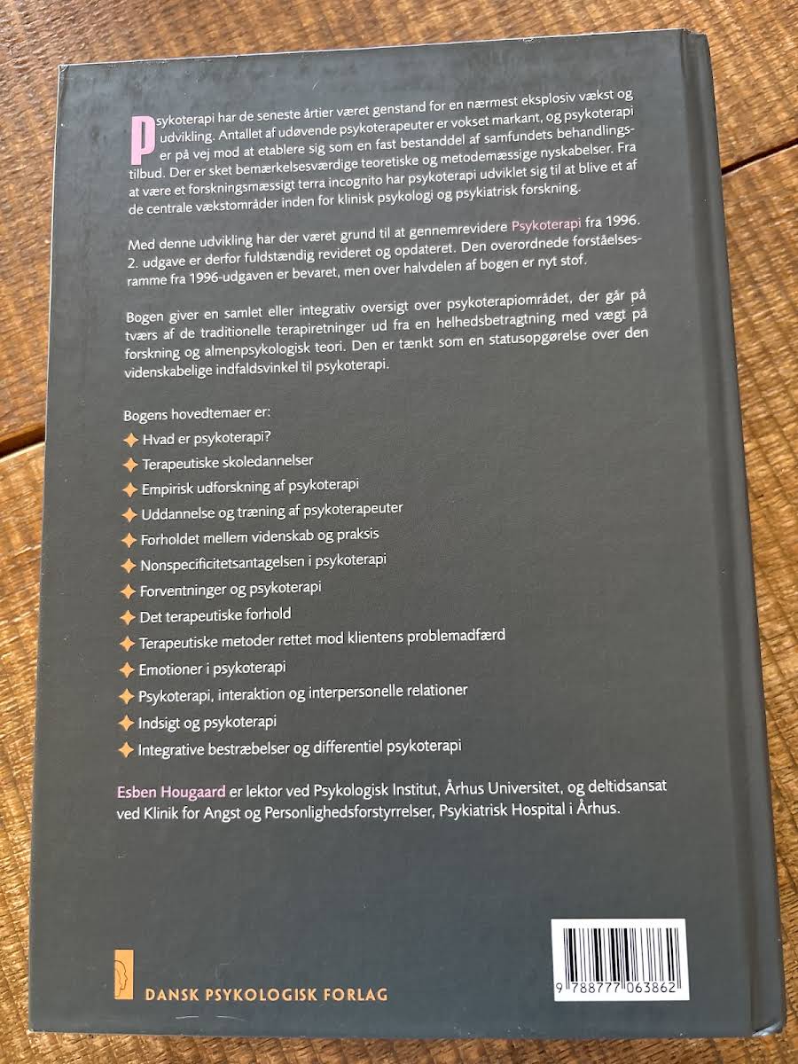 "Psykoterapi" af Esben Hougaard er en grundig og alsidig introduktion til terapifeltet, der giver et samlet overblik over de mange tilgange og teorier. Bogen er udarbejdet med udgangspunkt i både moderne forskning og almenpsykologisk teori, og den formidler viden på tværs af traditionelle terapiformer. Med en gennemrevideret tilgang skitserer forfatteren den videnskabelige fundament bag psykoterapi og stiller skarpt på den teoretiske og praktiske udvikling inden for området. Udgivet i 2004 af Dansk psykologisk Forlag, er denne 720-siders håndbog et uundværligt redskab for studerende, praktiserende og alle interesserede i at få et solidt indblik i psykoterapifaget.