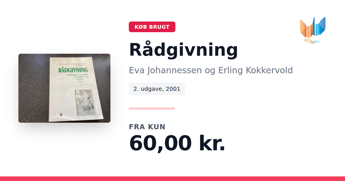 Lige nu kan du købe "Rådgivning" af Eva Johannessen og Erling Kokkervold til kun 60,00 kr. Bogen du ser her er brugt, og i god stand. Vi har i øjeblikket 2 eksemplarer til salg af "Rådgivning", så husk at se de forskellige udgaver.