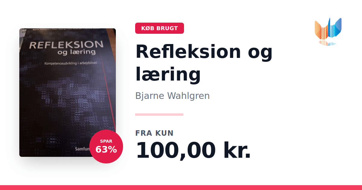 Lige nu kan du købe "Refleksion og læring" af Bjarne Wahlgren til kun 100,00 kr. Du sparer hele 63% af nyprisen! Bogen du ser her er brugt, og i perfekt stand. Vi har i øjeblikket 4 eksemplarer til salg af "Refleksion og læring", så husk at se de forskellige udgaver.