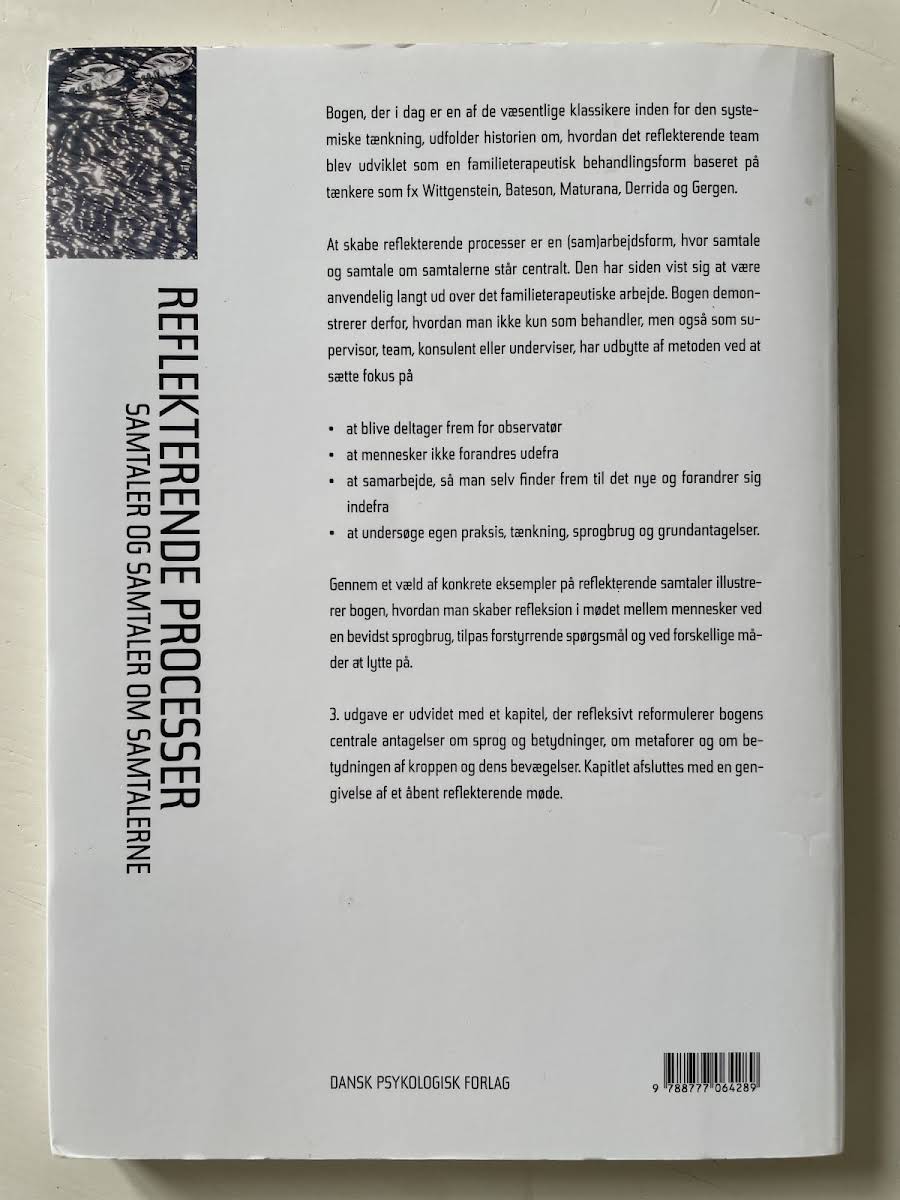 I "Reflekterende processer" dykker Tom Andersen ned i, hvordan en bevidst tilgang til samtale kan skabe rum for dyb refleksion og udvikling. Denne bog giver konkrete eksempler og praktiske redskaber, der understøtter en reflekterende dialog, hvilket er essentielt i arbejdet med supervision, teams, undervisning eller konsulentopgaver. Gennem en række illustrative cases viser Andersen, hvordan man ved at lytte, spørge og tale bevidst kan fremme en meningsfuld udveksling. Bogen er en værdifuld ressource for alle, der ønsker at styrke deres kommunikation og samarbejde gennem en struktureret tilgang til reflekterende processer.