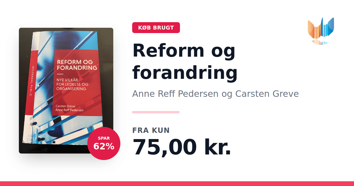 Lige nu kan du købe "Reform og forandring" af Anne Reff Pedersen og Carsten Greve til kun 75,00 kr. Du sparer hele 63% af nyprisen! Bogen du ser her er brugt, og i god stand. Vi har i øjeblikket 2 eksemplarer til salg af "Reform og forandring", så husk at se de forskellige udgaver.