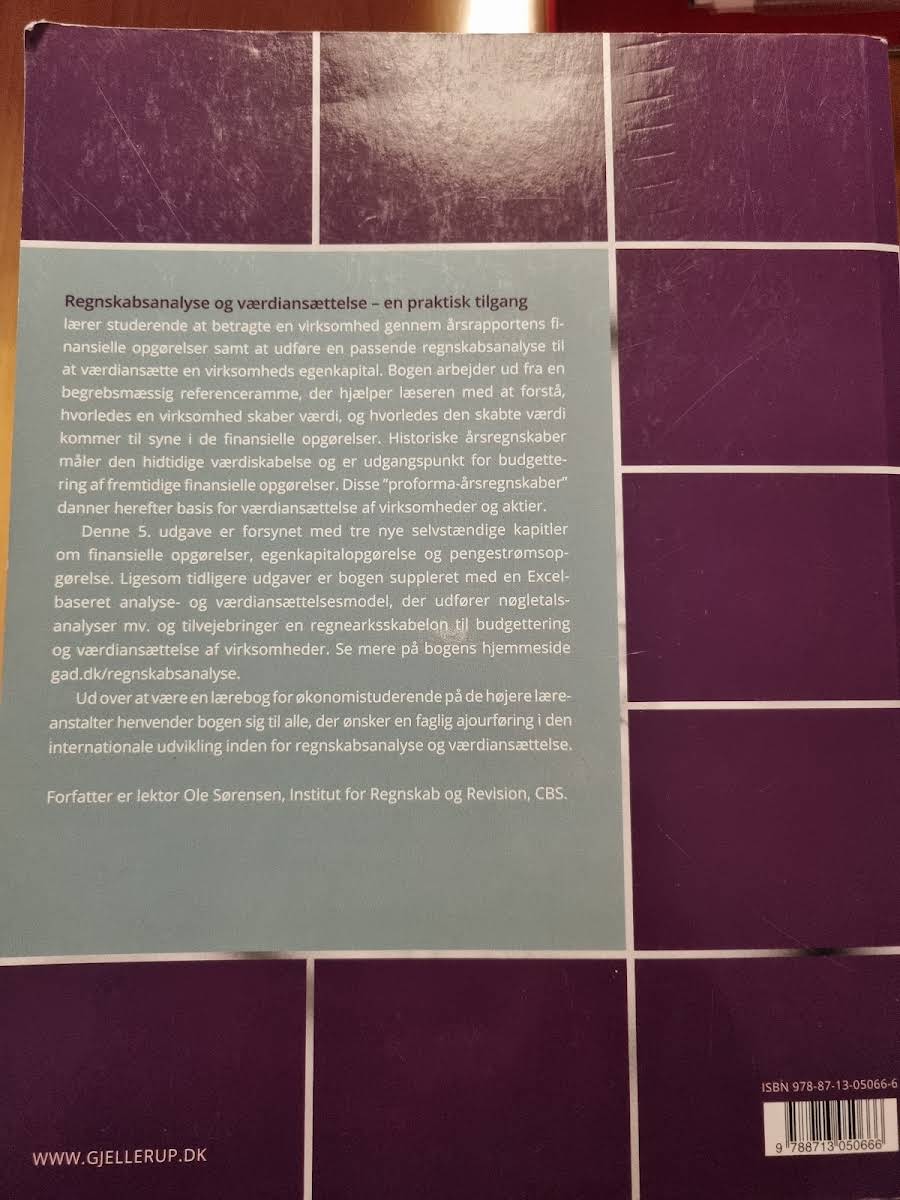 "Regnskabsanalyse og værdiansættelse" af Ole Sørensen giver en solid introduktion til de metoder, der anvendes til at vurdere en virksomheds egenkapital gennem finansielle opgørelser. Bogen belyser, hvordan den økonomiske værdi skabes og afspejles, og præsenterer læseren for en nøje udvalgt begrebsmæssig referenceramme, der gør det muligt at forstå de komplekse sammenhænge bag regnskabsanalysen. I 5. udgave, udgivet af Gjellerup i 2017, er der tilføjet tre selvstændige kapitler, der omhandler egenkapitalopgørelse, pengestrømsopgørelse og de finansielle opgørelser. Denne nytilgang uddyber, hvordan historiske årsregnskaber kan læses som indikatorer for tidligere værdiskabelse og danner grundlaget for fremtidige finansielle prognoser. Bogen suppleres med en Excel-baseret model, der effektivt understøtter nøgletalsanalyser og budgetteringsarbejde, og gør det nemt for læseren at omsætte teori til praksis. Med sin praktiske tilgang henvender "Regnskabsanalyse og værdiansættelse" sig til økonomistuderende og alle, der ønsker at få en dybere forståelse af regnskabsanalyse og den internationale udvikling inden for værdiansættelse.