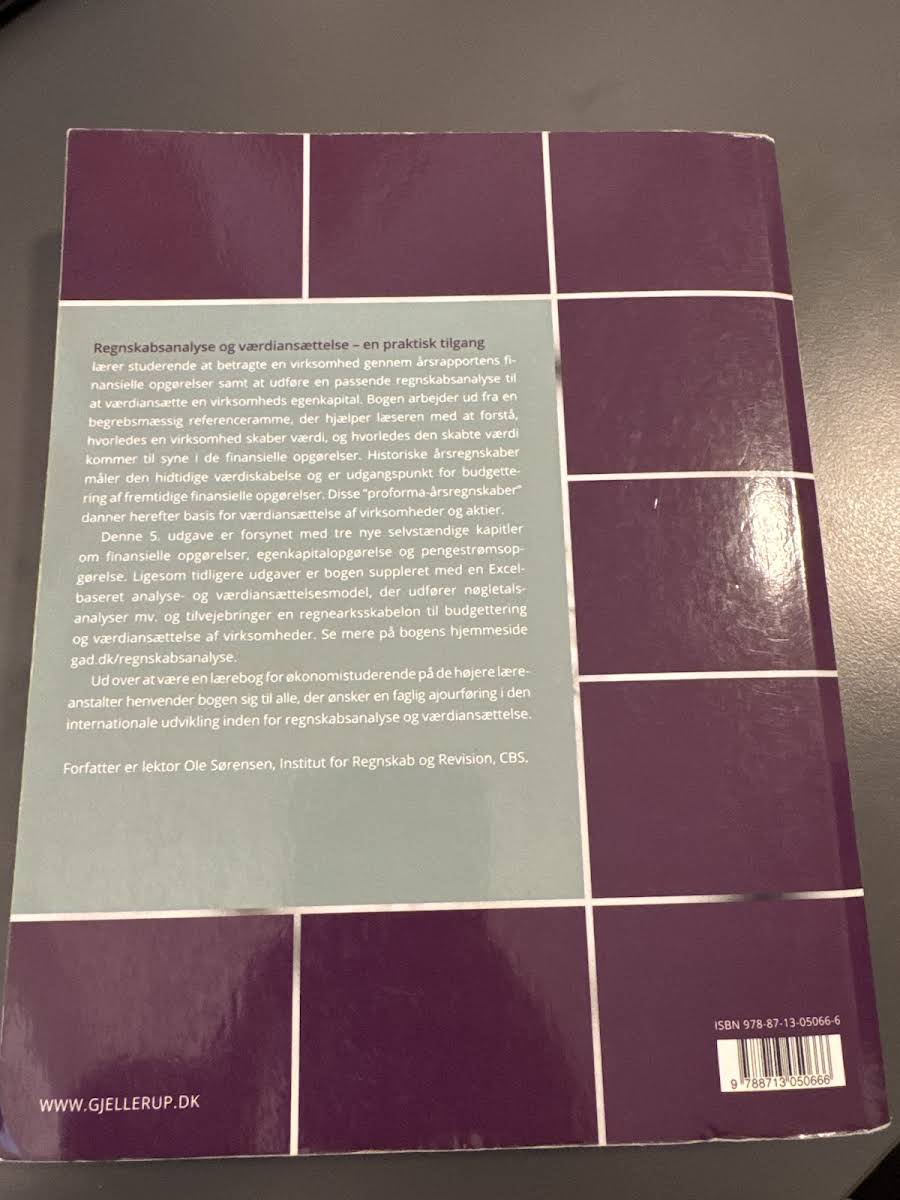 "Regnskabsanalyse og værdiansættelse" af Ole Sørensen giver en solid introduktion til de metoder, der anvendes til at vurdere en virksomheds egenkapital gennem finansielle opgørelser. Bogen belyser, hvordan den økonomiske værdi skabes og afspejles, og præsenterer læseren for en nøje udvalgt begrebsmæssig referenceramme, der gør det muligt at forstå de komplekse sammenhænge bag regnskabsanalysen. I 5. udgave, udgivet af Gjellerup i 2017, er der tilføjet tre selvstændige kapitler, der omhandler egenkapitalopgørelse, pengestrømsopgørelse og de finansielle opgørelser. Denne nytilgang uddyber, hvordan historiske årsregnskaber kan læses som indikatorer for tidligere værdiskabelse og danner grundlaget for fremtidige finansielle prognoser. Bogen suppleres med en Excel-baseret model, der effektivt understøtter nøgletalsanalyser og budgetteringsarbejde, og gør det nemt for læseren at omsætte teori til praksis. Med sin praktiske tilgang henvender "Regnskabsanalyse og værdiansættelse" sig til økonomistuderende og alle, der ønsker at få en dybere forståelse af regnskabsanalyse og den internationale udvikling inden for værdiansættelse.