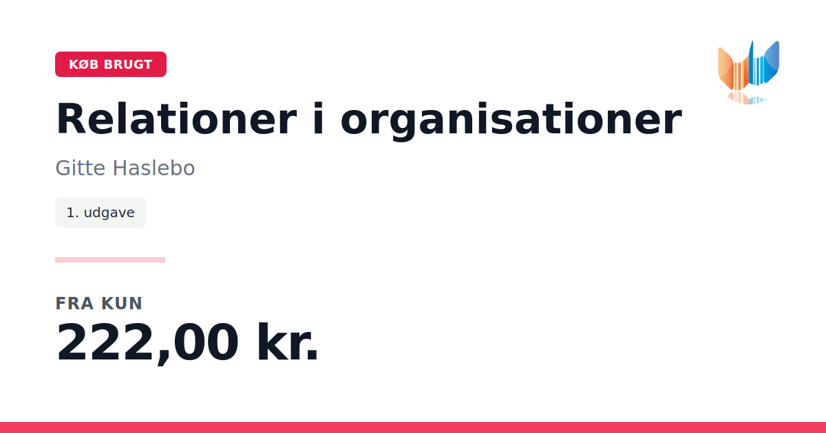 Lige nu kan du købe "Relationer i organisationer" af Gitte Haslebo til kun 222,00 kr. Bogen du ser her er brugt, og i perfekt stand. Vi har i øjeblikket kun et enkelt eksemplar til salg af "Relationer i organisationer", så slå til mens du kan!