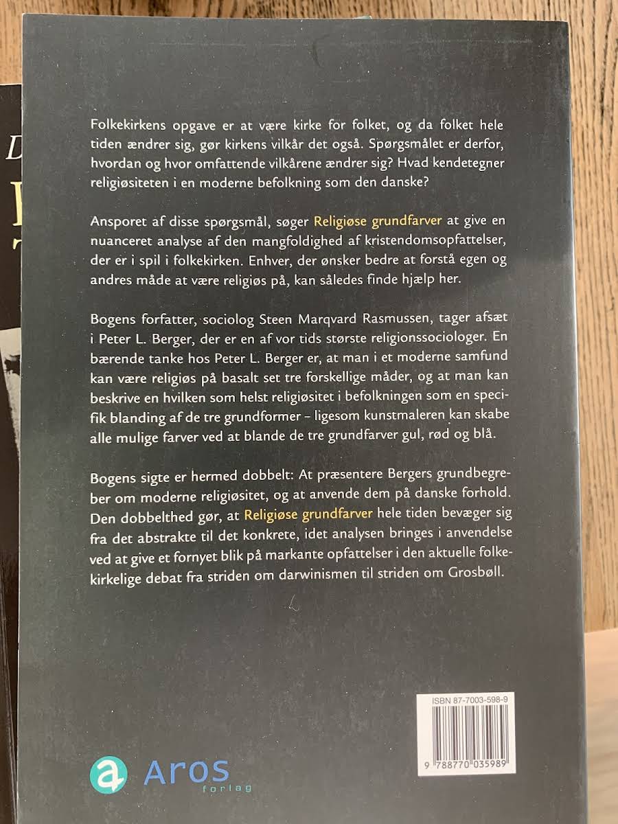 Religiøse grundfarver undersøger, hvordan de centrale idéer hos den anerkendte religionssociolog Peter L. Berger kan kaste lys over den moderne folkekirke. Steen Marqvard Rasmussen anvender Bergers opdeling af religiøsitet i tre grundformer til at forklare, hvordan disse kombineres og manifesterer sig i skiftende samfundsforhold og i dypningen af den danske tro. Bogen bevæger sig elegant mellem det abstrakte og det konkrete og illustrerer, hvordan teoretiske begreber kan få konkret betydning for debatter i folkekirken. Ved at analysere aktuelle religiøse opfattelser og strømninger, demonstreres, hvordan de grundlæggende "farver" i troens landskab stadig er med til at forme kirkens rolle og identitet. Religiøse grundfarver er et redskab til alle, der søger en nuanceret forståelse af, hvordan moderne religiøsitet udtrykkes og forhandles i en tid med intens forandring. Med skarpe indsigter og konkrete eksempler bidrager bogen til en fornyet debat om, hvad det vil sige at være troende i en moderne, pluralistisk kultur.