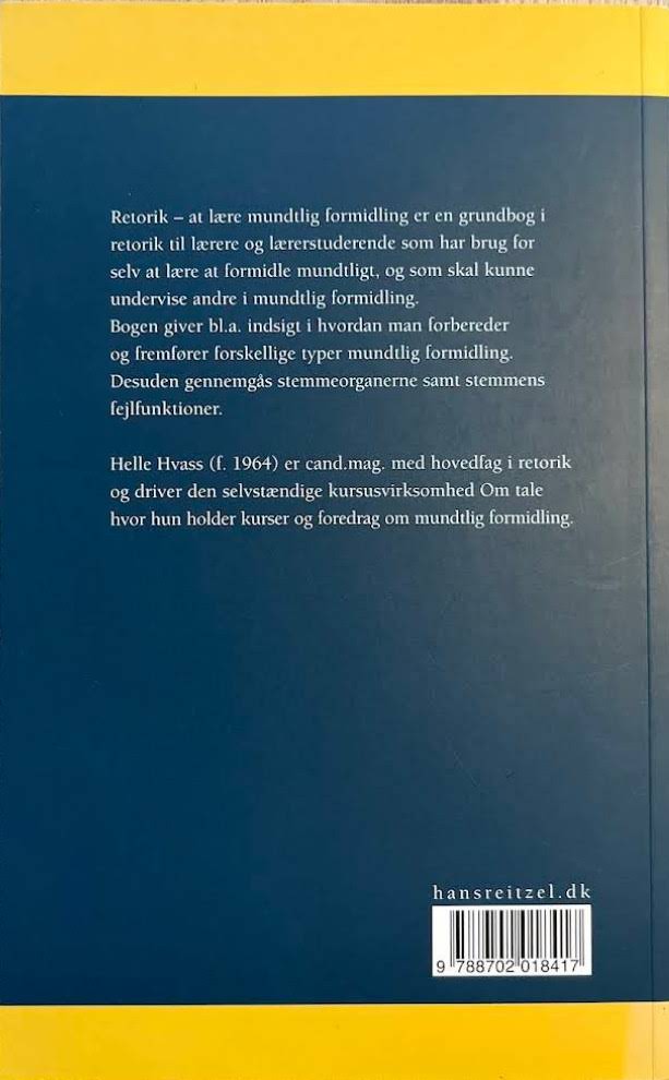 "Retorik" af Helle Hvass er en grundbog, der henvender sig til både den praktiserende lærer og den lærerstuderende. Bogen giver et solidt indblik i retorikkens verden og fremhæver vigtigheden af effektiv mundtlig formidling for dem, der dagligt står foran eleverne. Med et klart og didaktisk sprog illustreres, hvordan man både kan forbedre sin egen kommunikation og lære andre at gøre det. Gennem en række gennemarbejdede emner tager værket læseren i hånden og præsenterer en overskuelig tilgang til de mange facetter af retorik. Der stilles fokus på planlægning, forberedelse og fremførelse af forskellige mundtlige præsentationer, og bogen giver desuden indsigt i stemmeorganernes rolle og potentielle udfordringer. "Retorik" er et uundværligt redskab for alle, der ønsker at mestre kunsten at kommunikere.