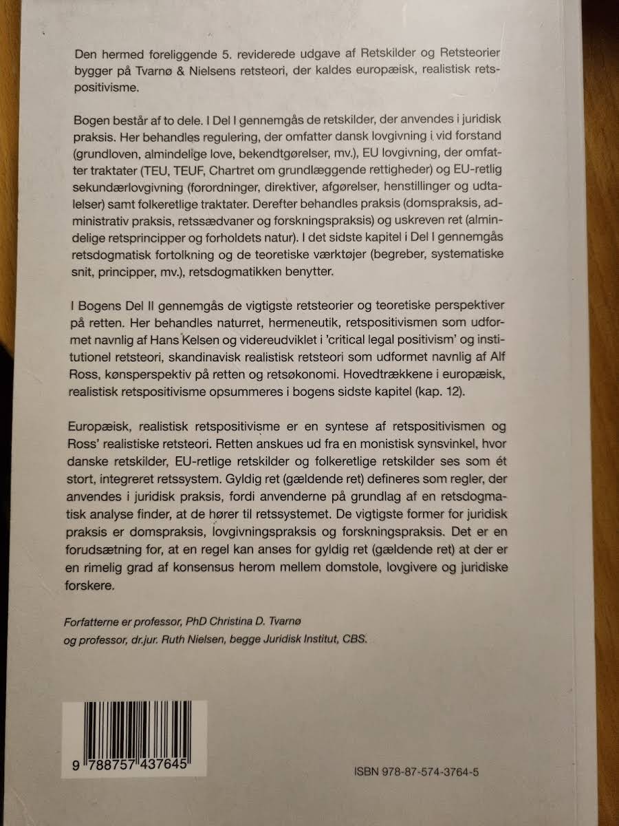 I den 5. reviderede udgave af Retskilder og retsteorier præsenterer Ruth Nielsen og Christina D. Tvarnø en integreret tilgang til, hvordan retskilder og retsteorier anvendes i moderne juridisk praksis. Bogen, som er funderet i den europæiske, realistiske retspositivisme, rummer en dybdegående undersøgelse af både de formelle og uformelle elementer, der udgør det juridiske landskab. I del I analyseres de centrale retskilder, der benyttes i praksis. Her skildres reguleringsspørgsmål med udgangspunkt i dansk lovgivning, EU-lovgivning og folkeretlige traktater. Desuden sættes der fokus på retspraksis, herunder domme, administrative afgørelser og forskningsbaserede tilgange samt den uskrevne ret, der bygger på alment anerkendte principper. Del I afsluttes med en gennemgang af retsdogmatisk fortolkning og de teoretiske værktøjer, der anvendes i den juridiske analyse. Del II bevæger sig ind i de væsentligste retsteorier og perspektiver på retten. Her udforskes naturretten, hermeneutikken, den klassiske retspositivisme – især som den er formuleret af Hans Kelsen og videreudviklet i den kritiske retpositivisme – samt institutionel retsteori, skandinavisk realistisk retsteori, kønsperspektiver og retsøkonomiske betragtninger. Bogen kulminerer med en opsummering af hovedtrækkene i den europæiske, realistiske retspositivisme, der integrerer de forskellige elementer til et samlet retssystem, hvor gyldige retsregler anerkendes ud fra den konsensus, der opstår i domstole, lovgivende instanser og blandt juridiske forskere.