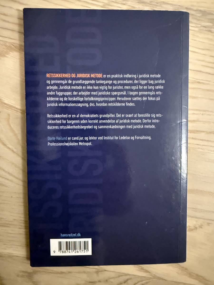 Retssikkerhed og juridisk metode byder på en praktisk introduktion til de grundlæggende principper og tankegange bag juridisk arbejde. Bogen gennemgår nøje de centrale retskilder og fortolkningsmetoder, der er afgørende for korrekt anvendelse af juridisk metode, og understreger hvordan disse elementer understøtter og beskytter borgernes retssikkerhed – en af demokratiets hjørnesten. Med fokus på hvordan man effektivt søger og benytter juridisk information, henvender bogen sig ikke kun til jurister, men også til andre faggrupper, der beskæftiger sig med juridiske problemstillinger. Forfatteren, Dorte Høilund, cand.jur. og lektor ved Institut for Ledelse og Forvaltning på Professionshøjskolen Metropol, præsenterer et solidt fundament for forståelsen af sammenhængen mellem juridisk metode og retssikkerhed.