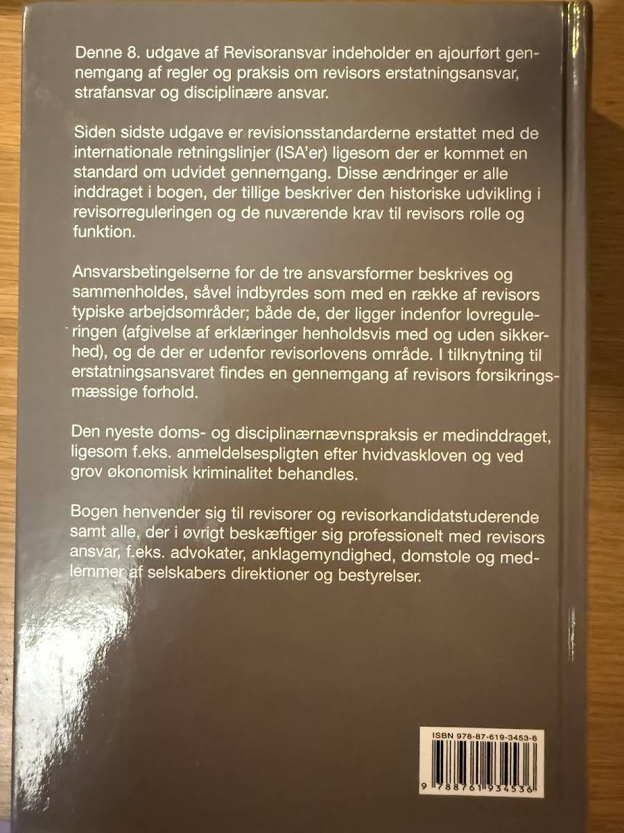 "Revisoransvar" giver en grundig gennemgang af revisors juridiske ansvar, opdelt i de erstatningsretlige, strafferetlige og disciplinære ansvarsområder. Bogen dykker ned i revisorernes funktioner og opgaver og forklarer, hvordan de juridiske rammer spiller ind i det daglige arbejde. I den 8. udgave, som er opdateret i forhold til 7. udgave fra 2008, er der integreret nye internationale retningslinjer (ISA’er) samt den standard, der omhandler udvidet gennemgang. Ændringerne reflekterer den stigende internationalisering og de seneste praksisser inden for revisionsområdet. "Revisoransvar" henvender sig til revisorer, studerende under revisionsuddannelser og andre professionelle, der arbejder med revisoransvar som eksempelvis jurister, anklagemyndighed, domstole samt medlemmer af ledelsesorganer. Med bidrag fra Lars Bo Langsted, Paul Krüger Andersen og Lars Kiertzner tilbyder bogen en aktuel og indsigtfuld tilgang til vor tids revisionsret.