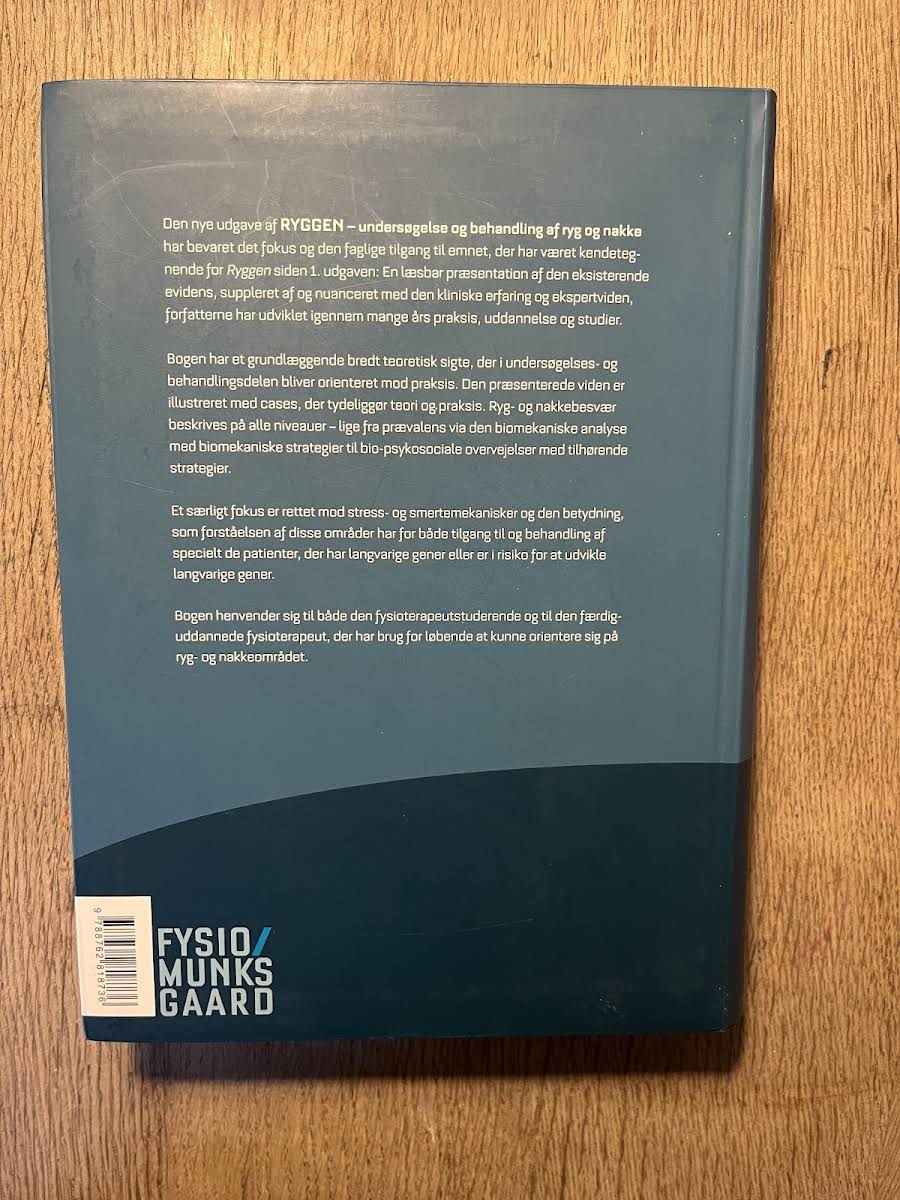 Med udgivelsen af første udgave af Ryggen præsenterer forfatterne Per Kjær, Heidi Eirikstoft, Flemming Enoch og Per Lind en grundig og lettilgængelig gennemgang af undersøgelse og behandling af ryg og nakke. Bogen bygger på en solid evidensbase og kombinerer den nyeste forskning med mange års klinisk erfaring. Den teoretiske gennemgang understøttes af veludvalgte cases, som tydeliggør overgangen fra teori til praksis. Fokus ligger på en helhedsorienteret forståelse af ryg- og nakkebesvær – fra biomekaniske analyser og strategier til bio-psykosociale overvejelser og stress- samt smertemekanismer. Denne tilgang giver et nuanceret billede af, hvordan forskellige behandlingsstrategier kan anvendes til patienter med langvarige eller potentielt langvarige problemer. Ryggen henvender sig både til fysioterapeutstuderende og til den erfarne kliniker, der løbende søger opdateret og anvendelig viden på området.