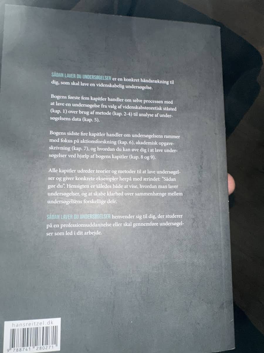"Sådan laver du undersøgelser" er en praktisk guide, der henvender sig til både studerende på professionsuddannelser og fagfolk, der skal lave undersøgelser som led i deres arbejde. Bogen inspirerer og giver konkrete forslag til, hvordan man fra start til slut kan gribe undersøgelsesprocessen an. I de første kapitler forklares, hvordan man udvælger et videnskabsteoretisk udgangspunkt, anvender metoder og indsamler data, mens de afsluttende kapitler fokuserer på undersøgelsens overordnede rammer. Aktionsforskning, akademisk skrivning og øvelser i praksis præsenteres med klare og håndgribelige eksempler, der gør teorien tilgængelig. Med en kombination af teoretiske indsigter og praktiske råd skaber bogen en helhedsforståelse af, hvordan de enkelte dele af en undersøgelse hænger sammen. Denne sammenhængende tilgang giver læseren redskaberne til både at forstå og udføre undersøgelser på en struktureret og effektiv måde.