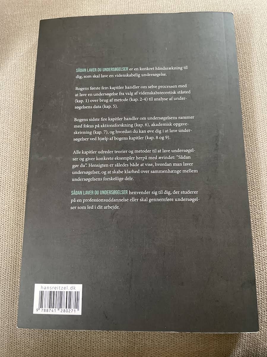 "Sådan laver du undersøgelser" er en praktisk guide, der henvender sig til både studerende på professionsuddannelser og fagfolk, der skal lave undersøgelser som led i deres arbejde. Bogen inspirerer og giver konkrete forslag til, hvordan man fra start til slut kan gribe undersøgelsesprocessen an. I de første kapitler forklares, hvordan man udvælger et videnskabsteoretisk udgangspunkt, anvender metoder og indsamler data, mens de afsluttende kapitler fokuserer på undersøgelsens overordnede rammer. Aktionsforskning, akademisk skrivning og øvelser i praksis præsenteres med klare og håndgribelige eksempler, der gør teorien tilgængelig. Med en kombination af teoretiske indsigter og praktiske råd skaber bogen en helhedsforståelse af, hvordan de enkelte dele af en undersøgelse hænger sammen. Denne sammenhængende tilgang giver læseren redskaberne til både at forstå og udføre undersøgelser på en struktureret og effektiv måde.