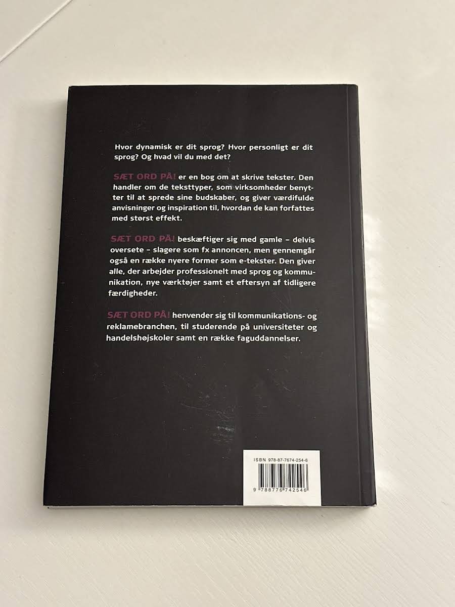 Sæt ord på! er en inspirerende bog, der kaster lys over kunsten at skrive tekster, som kommunikerer klart og effektivt. Med et skarpt blik for både traditionelle og moderne teksttyper dykker Thomas Hestbaek Andersen ned i de kommunikationsformer, virksomheder benytter for at få deres budskaber ud. Bogen præsenterer et væld af værktøjer og metoder, der kan hjælpe professionelle med at forfine deres tekstproduktion. Med et solidt fundament i dansk virksomhedskommunikation og en pedagogisk tilgang, tilbyder Sæt ord på! både en teoretisk og praktisk indføring i tekstforfatning. Værket henvender sig bredt – fra studerende og undervisere til kommunikationsfolk og reklamebranchen – og opfordrer til, at man sætter ord på sit budskab med både kreativitet og præcision.