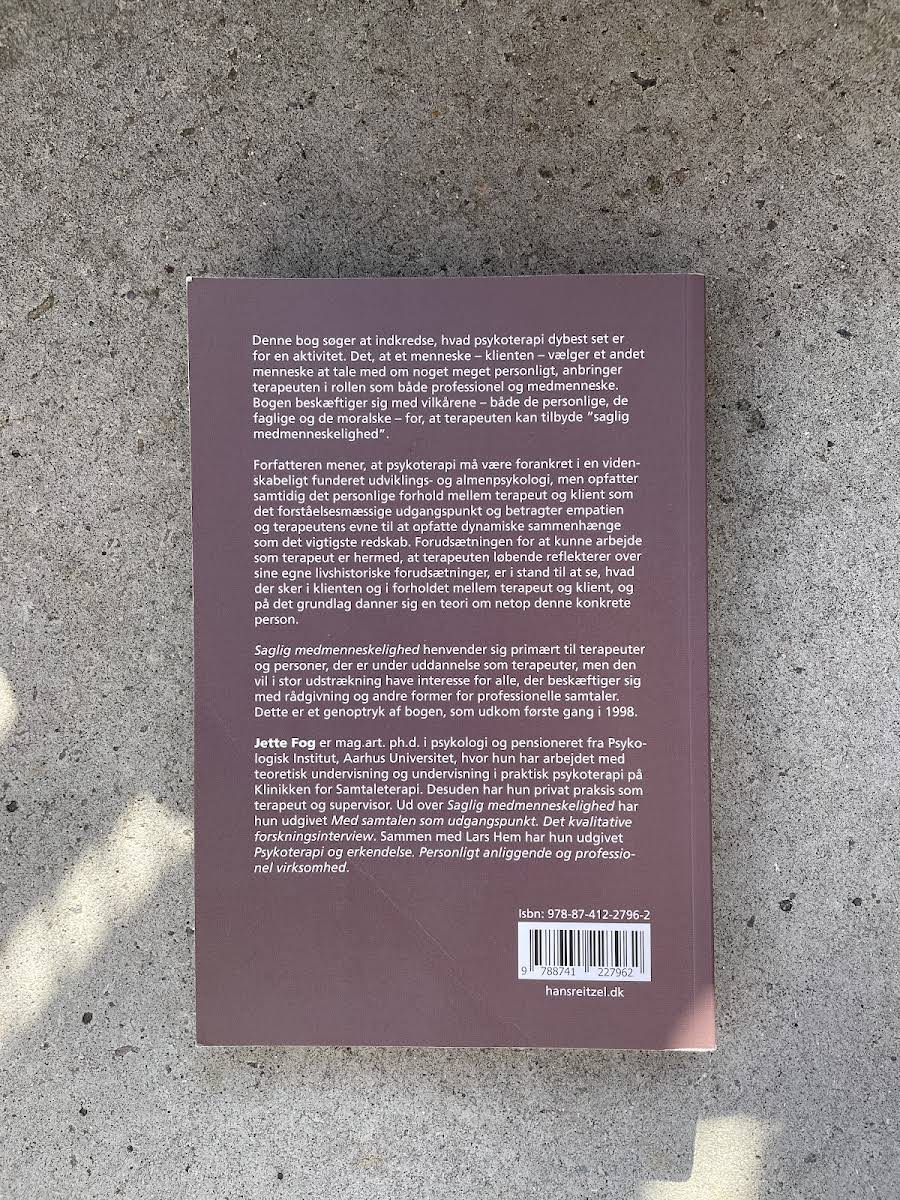 "Saglig medmenneskelighed" udforsker den grundlæggende natur af psykoterapi og stiller skarpt på, hvordan et menneskes ønske om at dele noget særligt personligt fører terapeuten ind i rollen som både professionel og medmenneske. Jette Fog redegør for de personlige, faglige og moralske vilkår, der er nødvendige for at kunne tilbyde en terapi præget af både saglighed og empati. Bogen understreger betydningen af, at terapeuten kontinuerligt reflekterer over sine egne livsomstændigheder, er opmærksom på klientens signaler og dynamikkerne i deres samspil og derved former en individuel forståelse af den enkelte klients udvikling. "Saglig medmenneskelighed" henvender sig primært til terapeuter og dem, der er under uddannelse til at blive det, men den er også relevant for alle, der arbejder med rådgivning og professionelle samtaler.