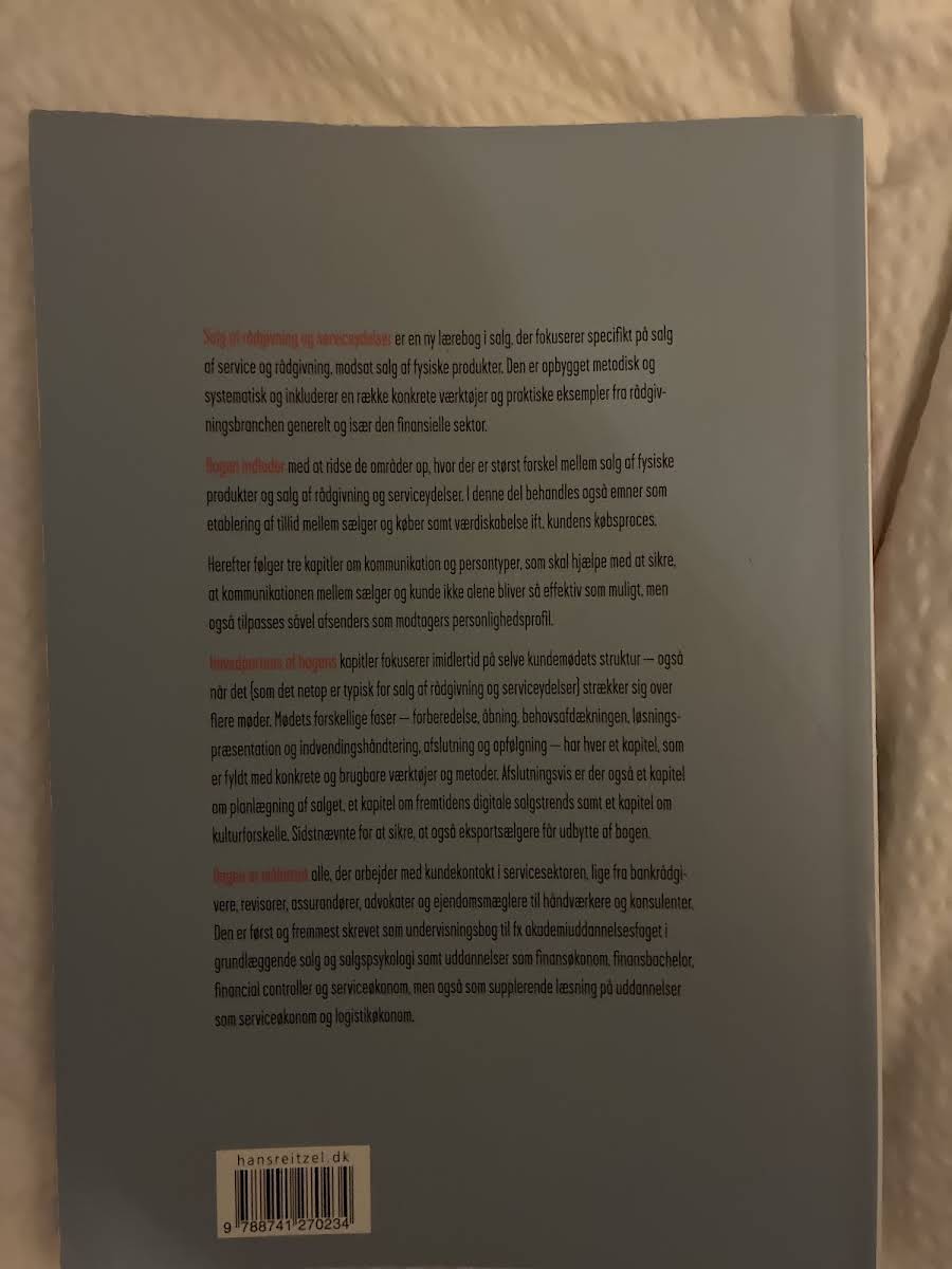 Salg er ligesom et håndværk, hvor de rette redskaber gør hele forskellen. I Salg af rådgivning og serviceydelser præsenterer Jens Lassen et omfattende perspektiv på, hvordan proaktivt salg og en velfyldt værktøjskasse giver sælgeren de bedste forudsætninger for at matche kundens behov og skabe værdifulde løsninger. Bogen fokuserer på, hvordan principper og metoder, der også anvendes i butikssalg inden for brancher som elektronik, vin, køkkener, badeværelser og autoværksteder, knytter ekspertrollen tæt sammen med rådgivende salgsteknikker. Bogen indledes med en klar afgrænsning af forskellene mellem salg af fysiske produkter og salg af rådgivning og serviceydelser, hvorefter de fundamentale elementer i en succesfuld salgsproces – forståelsen for kundens købsproces, værdiskabelse og tillid – udfoldes i detaljer. Herefter uddybes strukturen og de forskellige faser i kundemødet, inden kapitler om salgsplanlægning, personlig effektivitet og fremtidens digitale trends runder bogen af. Med sit indsigtsfulde indhold retter bogen sig primært mod studerende inden for finansøkonomi, serviceøkonomi og beslægtede uddannelser, men kan ligeledes anvendes som en værdifuld ressource på tværs af adskillige fagområder.