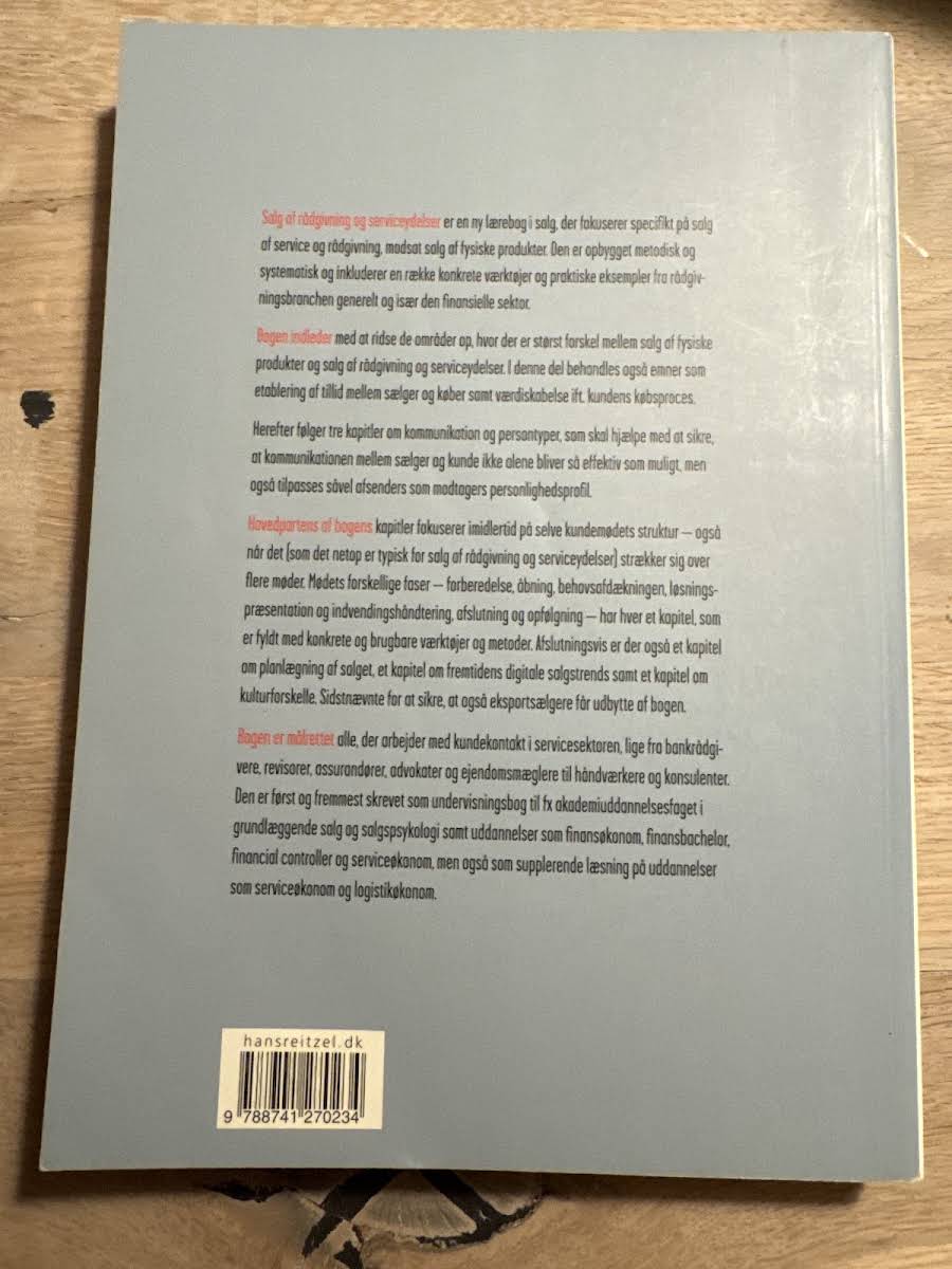 Salg er ligesom et håndværk, hvor de rette redskaber gør hele forskellen. I Salg af rådgivning og serviceydelser præsenterer Jens Lassen et omfattende perspektiv på, hvordan proaktivt salg og en velfyldt værktøjskasse giver sælgeren de bedste forudsætninger for at matche kundens behov og skabe værdifulde løsninger. Bogen fokuserer på, hvordan principper og metoder, der også anvendes i butikssalg inden for brancher som elektronik, vin, køkkener, badeværelser og autoværksteder, knytter ekspertrollen tæt sammen med rådgivende salgsteknikker. Bogen indledes med en klar afgrænsning af forskellene mellem salg af fysiske produkter og salg af rådgivning og serviceydelser, hvorefter de fundamentale elementer i en succesfuld salgsproces – forståelsen for kundens købsproces, værdiskabelse og tillid – udfoldes i detaljer. Herefter uddybes strukturen og de forskellige faser i kundemødet, inden kapitler om salgsplanlægning, personlig effektivitet og fremtidens digitale trends runder bogen af. Med sit indsigtsfulde indhold retter bogen sig primært mod studerende inden for finansøkonomi, serviceøkonomi og beslægtede uddannelser, men kan ligeledes anvendes som en værdifuld ressource på tværs af adskillige fagområder.