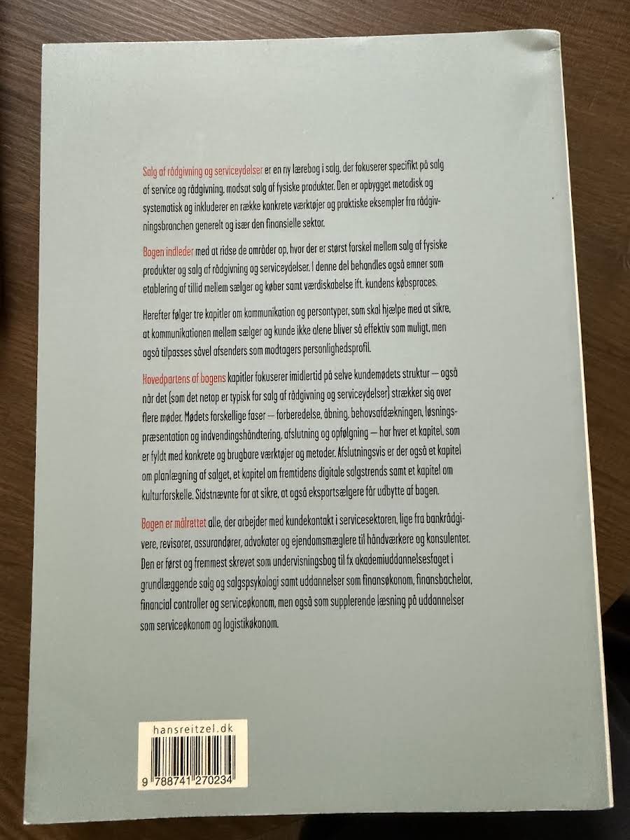 Salg er ligesom et håndværk, hvor de rette redskaber gør hele forskellen. I Salg af rådgivning og serviceydelser præsenterer Jens Lassen et omfattende perspektiv på, hvordan proaktivt salg og en velfyldt værktøjskasse giver sælgeren de bedste forudsætninger for at matche kundens behov og skabe værdifulde løsninger. Bogen fokuserer på, hvordan principper og metoder, der også anvendes i butikssalg inden for brancher som elektronik, vin, køkkener, badeværelser og autoværksteder, knytter ekspertrollen tæt sammen med rådgivende salgsteknikker. Bogen indledes med en klar afgrænsning af forskellene mellem salg af fysiske produkter og salg af rådgivning og serviceydelser, hvorefter de fundamentale elementer i en succesfuld salgsproces – forståelsen for kundens købsproces, værdiskabelse og tillid – udfoldes i detaljer. Herefter uddybes strukturen og de forskellige faser i kundemødet, inden kapitler om salgsplanlægning, personlig effektivitet og fremtidens digitale trends runder bogen af. Med sit indsigtsfulde indhold retter bogen sig primært mod studerende inden for finansøkonomi, serviceøkonomi og beslægtede uddannelser, men kan ligeledes anvendes som en værdifuld ressource på tværs af adskillige fagområder.