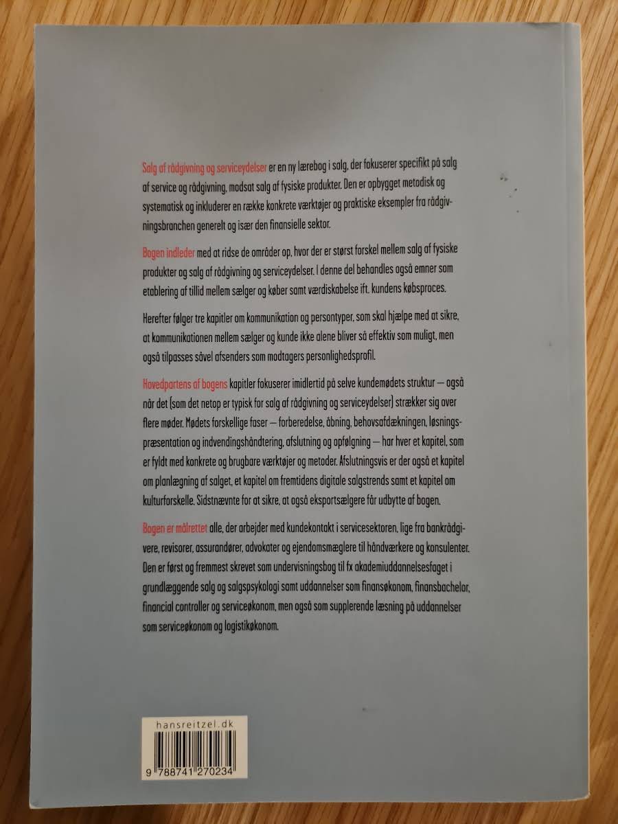 Salg er ligesom et håndværk, hvor de rette redskaber gør hele forskellen. I Salg af rådgivning og serviceydelser præsenterer Jens Lassen et omfattende perspektiv på, hvordan proaktivt salg og en velfyldt værktøjskasse giver sælgeren de bedste forudsætninger for at matche kundens behov og skabe værdifulde løsninger. Bogen fokuserer på, hvordan principper og metoder, der også anvendes i butikssalg inden for brancher som elektronik, vin, køkkener, badeværelser og autoværksteder, knytter ekspertrollen tæt sammen med rådgivende salgsteknikker. Bogen indledes med en klar afgrænsning af forskellene mellem salg af fysiske produkter og salg af rådgivning og serviceydelser, hvorefter de fundamentale elementer i en succesfuld salgsproces – forståelsen for kundens købsproces, værdiskabelse og tillid – udfoldes i detaljer. Herefter uddybes strukturen og de forskellige faser i kundemødet, inden kapitler om salgsplanlægning, personlig effektivitet og fremtidens digitale trends runder bogen af. Med sit indsigtsfulde indhold retter bogen sig primært mod studerende inden for finansøkonomi, serviceøkonomi og beslægtede uddannelser, men kan ligeledes anvendes som en værdifuld ressource på tværs af adskillige fagområder.
