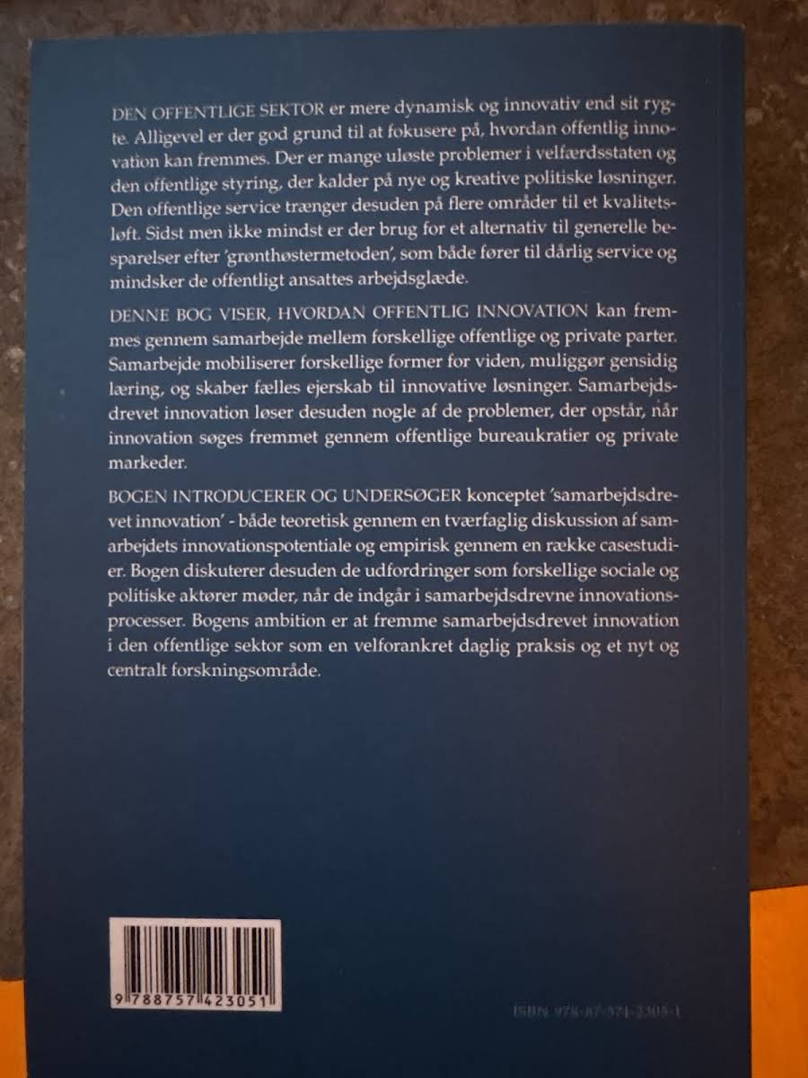 "Samarbejdsdrevet innovation i den offentlige sektor" er en indsigtsfuld bog af Eva Sørensen, der undersøger, hvordan offentlig innovation kan fremmes gennem samarbejde mellem forskellige aktører. Bogen sætter fokus på de dynamiske muligheder, som opstår, når offentlige og private parter går sammen for at udvikle nye løsninger. Med en kombination af teoretiske perspektiver og empiriske eksempler belyses både potentialet og de udfordringer, der opstår i innovationsprocesser styret af samarbejde. Eva Sørensen demonstrerer, hvordan fælles viden og gensidig læring kan omdanne den offentlige sektors arbejdsmetoder og skabe robuste og innovative løsninger. Bogen opfordrer til, at samarbejde bliver en naturlig og integreret del af den offentlige praksis og bidrager til at udforske et centralt forskningsområde med stor relevans for nutidens samfund. Med sit dybdegående indblik i de sociale og politiske aktørers roller, leverer denne bog et solidt bidrag til forståelsen af samarbejdsbaseret innovation i den offentlige sektor.