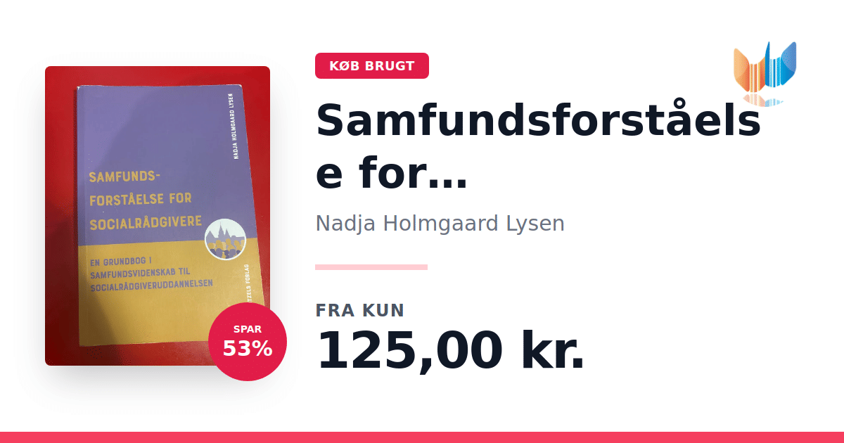 Lige nu kan du købe "Samfundsforståelse for socialrådgivere" af Nadja Holmgaard Lysen til kun 125,00 kr. Du sparer hele 53% af nyprisen! Bogen du ser her er brugt, og i god stand. Vi har i øjeblikket kun et enkelt eksemplar til salg af "Samfundsforståelse for socialrådgivere", så slå til mens du kan!