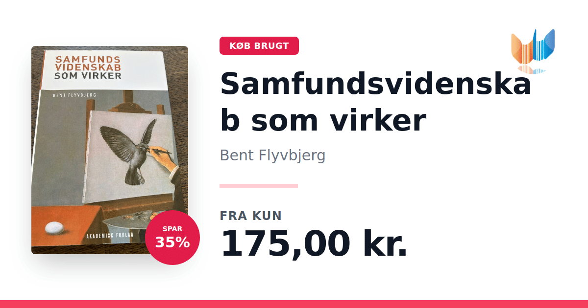 Lige nu kan du købe "Samfundsvidenskab som virker" af Bent Flyvbjerg til kun 175,00 kr. Du sparer hele 35% af nyprisen! Bogen du ser her er brugt, og i perfekt stand. Vi har i øjeblikket kun et enkelt eksemplar til salg af "Samfundsvidenskab som virker", så slå til mens du kan!