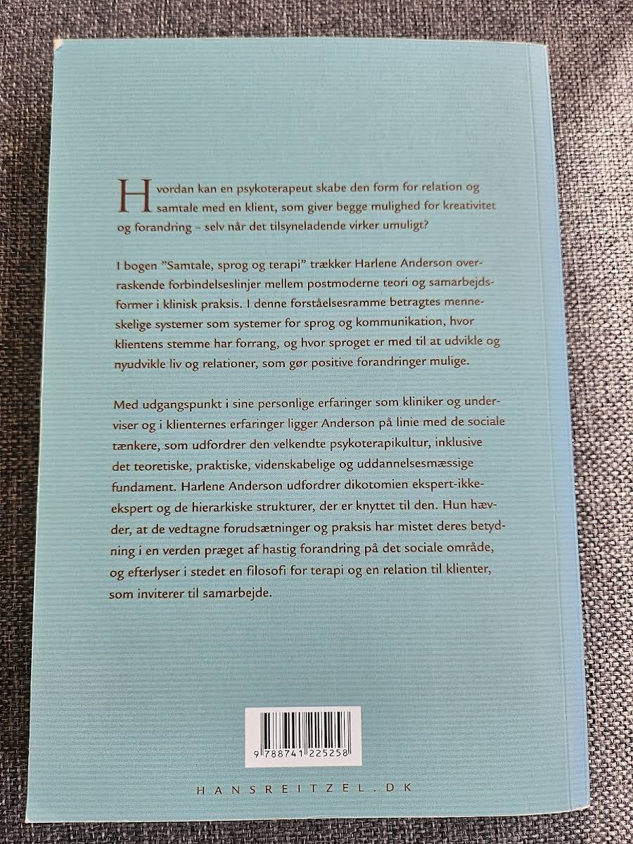 Hvordan kan terapeuter skabe rum for meningsfuld dialog og forandring – selv når udfordringerne synes uoverstigelige? I "Samtale, sprog og terapi: Et postmoderne perspektiv" præsenterer Harlene Anderson overraskende synspunkter, hvor postmoderne teori og klinisk praksis bliver forenet. Bogen ser menneskelige relationer som dynamiske sprog- og kommunikationssystemer, hvor klientens stemme får plads og bliver et vigtigt redskab til at fremme positiv udvikling. Med udgangspunkt i både egne erfaringer og observationer fra klinisk arbejde udfordrer Anderson den traditionelle psykoterapikultur og de fastlåste roller, der ofte findes i terapien. Hun fremhæver, hvordan samarbejdende relationer og et nyt perspektiv på ekspertise kan åbne op for innovative og livsbekræftende tilgange i terapi.