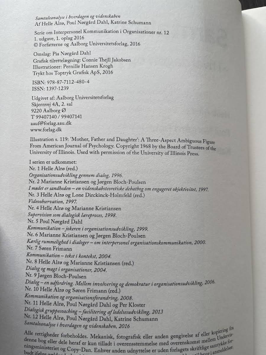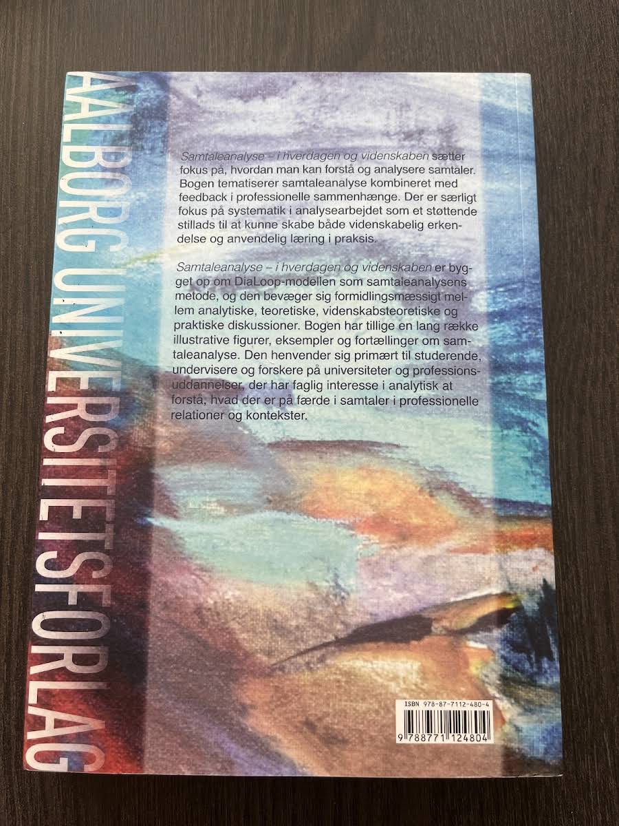 Samtaleanalyse udfolder en dybdegående tilgang til forståelsen af, hvordan vi kan observere og analysere de samtaler, der præger både hverdagen og de professionelle arenaer. Bogen kombinerer et teoretisk fundament med praktiske redskaber, der understøtter systematisk analysearbejde og muliggør en omsætning af videnskabelig indsigt til brugbar læring. Med udgangspunkt i DiaLoop-modellen guider forfatterne – Helle Alrø, Poul Nørgård Dahl og Katrine Schumann – læseren gennem en række analytiske, teoretiske og praktiske diskussioner. Illustrative figurer, eksempler og fortællinger supplerer metodebeskrivelserne og gør det muligt at anvende samtaleanalysen både i forskning og undervisning. Bogen henvender sig særligt til studerende, undervisere og forskere, der med et analytisk blik ønsker at forstå indviklede kommunikationsmønstre i professionelle relationer og kontekster.