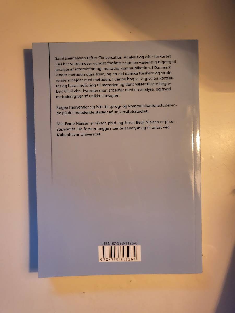 "Samtaleanalyse" af Mie Femø Nielsen og Søren Bech Nielsen giver en skarp og kortfattet introduktion til samtaleanalysens metoder, som i dag anvendes bredt til at forstå interaktion og mundtlig kommunikation. Bogen forklarer de grundlæggende begreber samt metodens anvendelsesmuligheder, hvilket gør den til et ideelt redskab for sprog- og kommunikationsstuderende samt praktikere, der ønsker at foretage dybdegående analyser af samtaler. Med fokus på de væsentligste aspekter af analyseprocessen præsenterer forfatterne en praksisnær tilgang til, hvordan man kan arbejde med samtaleanalyse i akademiske og professionelle sammenhænge. Denne paperback udgave fra 2005, udgivet af Samfundslitteratur, på 272 sider, byder på alt det nødvendige grundlag for at komme godt i gang med metodens anvendelse.
