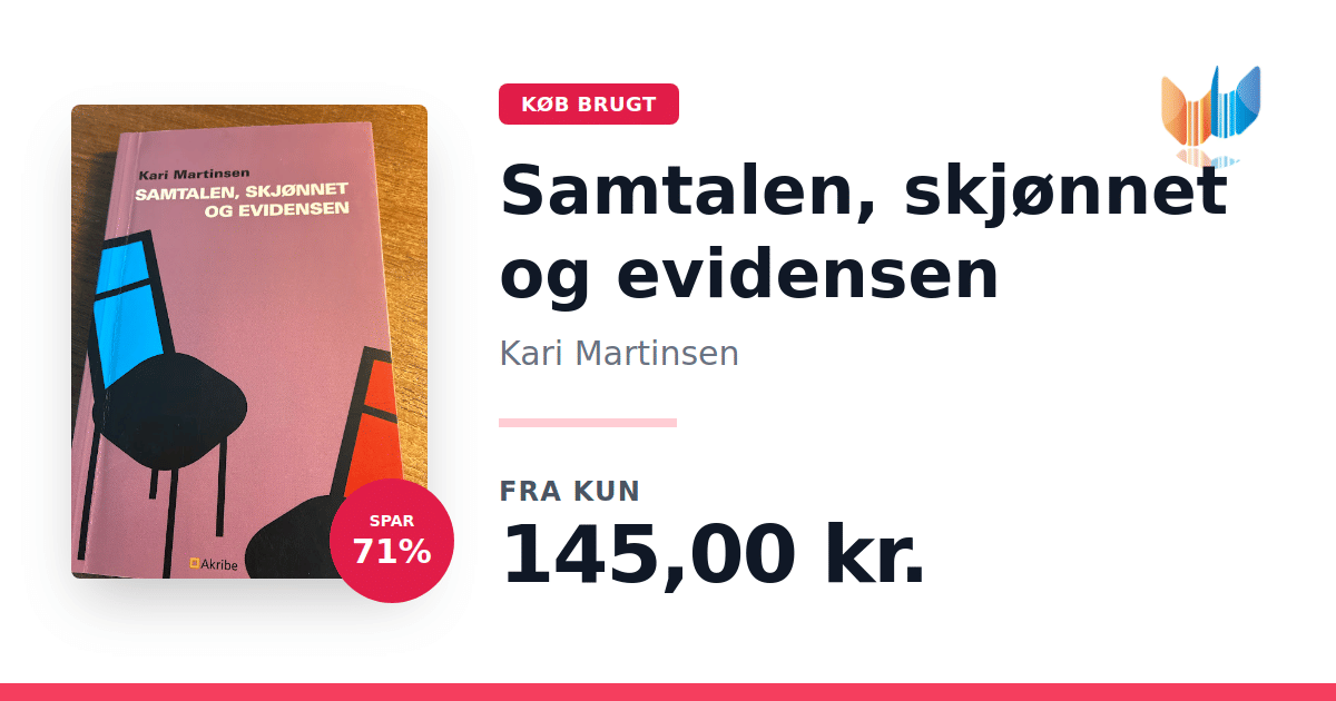 Lige nu kan du købe "Samtalen, skjønnet og evidensen" af Kari Martinsen til kun 145,00 kr. Du sparer hele 71% af nyprisen! Bogen du ser her er brugt, og i perfekt stand. Vi har i øjeblikket kun et enkelt eksemplar til salg af "Samtalen, skjønnet og evidensen", så slå til mens du kan!