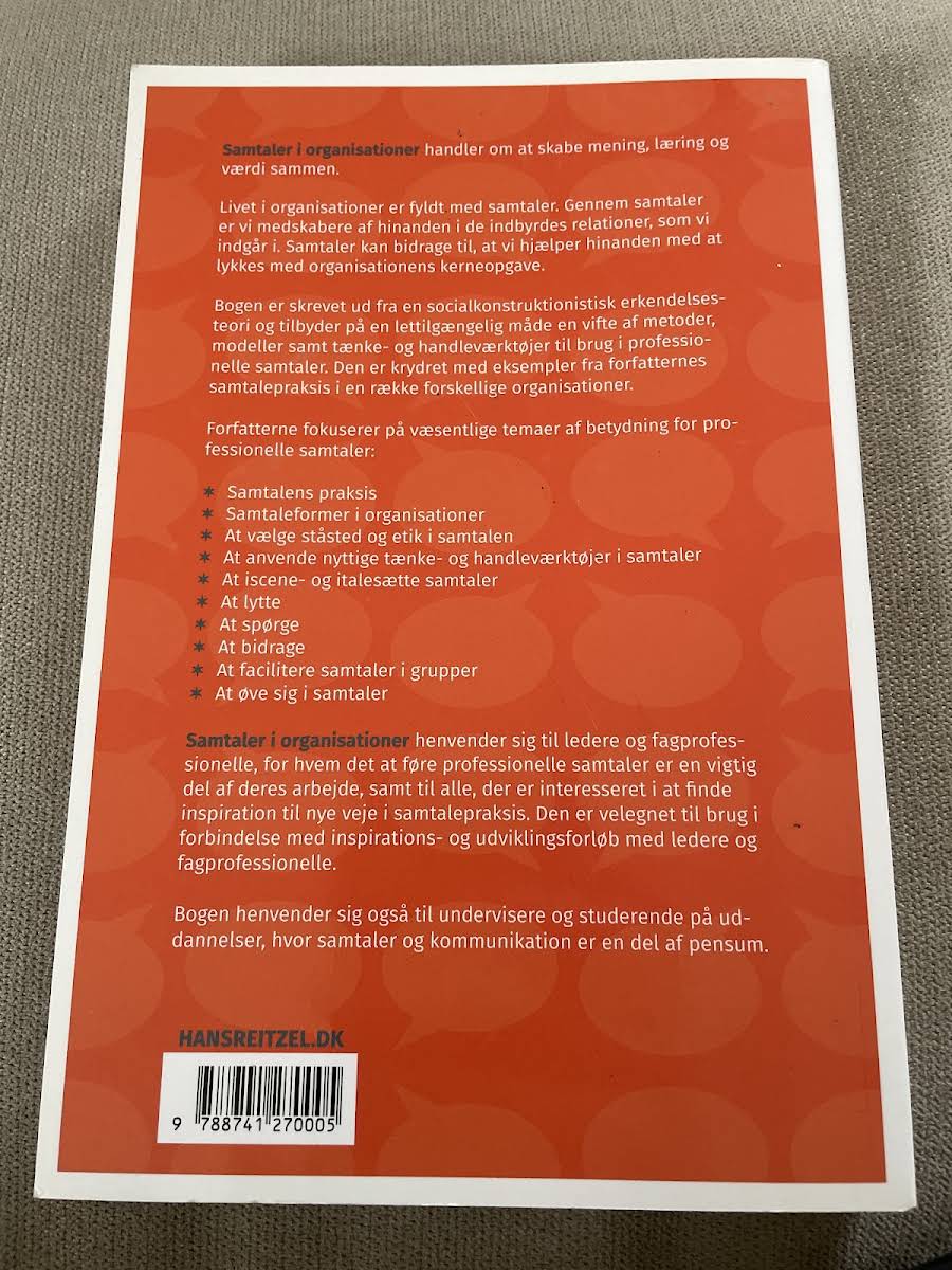 Samtaler i organisationer giver læseren et dybt indblik i, hvordan meningsfulde dialoger kan styrke relationer og skabe fælles læring. Med udgangspunkt i en socialkonstruktionistisk erkendelsesteori præsenterer Gert Rosenkvist og Peter Hansen-Skovmoes en række metoder, modeller og praktiske værktøjer, der gør det muligt at navigere i de komplekse samtaler, der præger hverdagen i en organisation. Bogen udforsker temaer som samtalens praksis, forskellige samtaleformer samt vigtigheden af at vælge et etisk ståsted i dialogen. Den tilbyder konkrete redskaber til at formulere, lytte og spørge – alt sammen med det formål at facilitere og berige både individuelle og gruppeorienterede samtaler. Samtaler i organisationer henvender sig til ledere, fagprofessionelle, undervisere og studerende, der ønsker at udvikle deres forståelse af, hvordan professionelle samtaler kan understøtte organisationens kerneopgave.