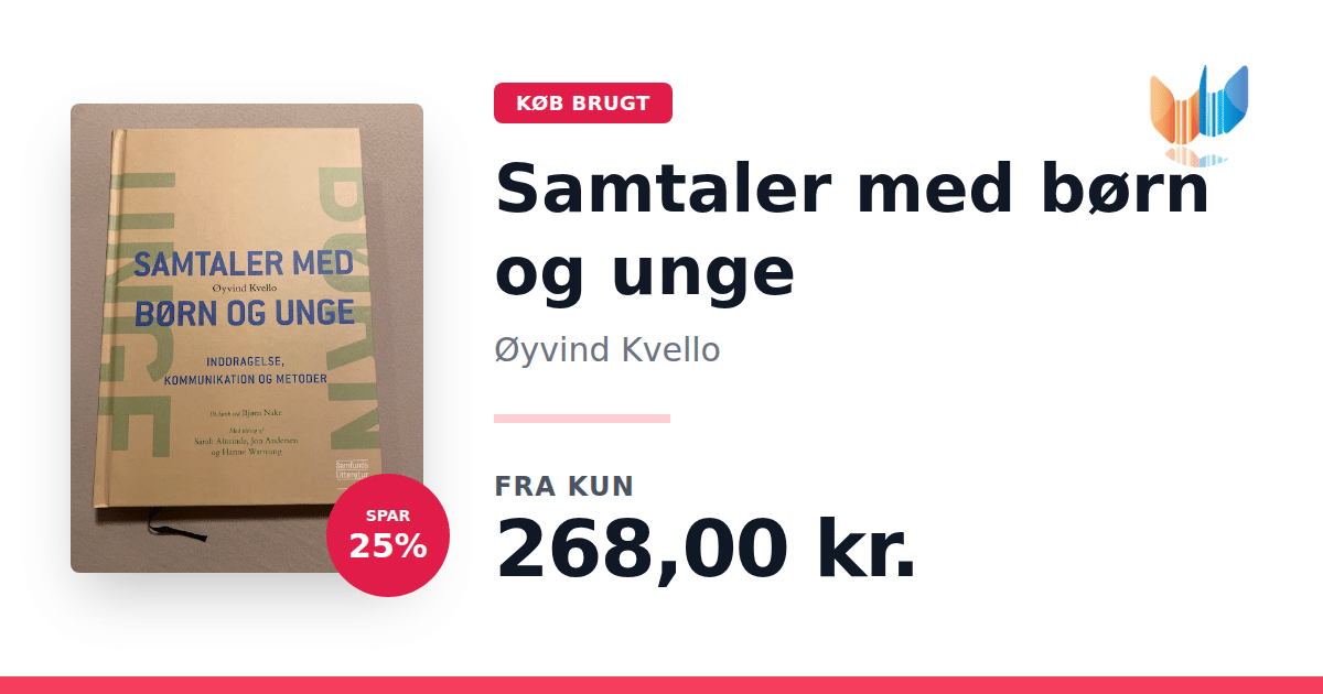 Lige nu kan du købe "Samtaler med børn og unge" af Øyvind Kvello til kun 268,00 kr. Du sparer hele 25% af nyprisen! Bogen du ser her er brugt, og i perfekt stand. Vi har i øjeblikket kun et enkelt eksemplar til salg af "Samtaler med børn og unge", så slå til mens du kan!