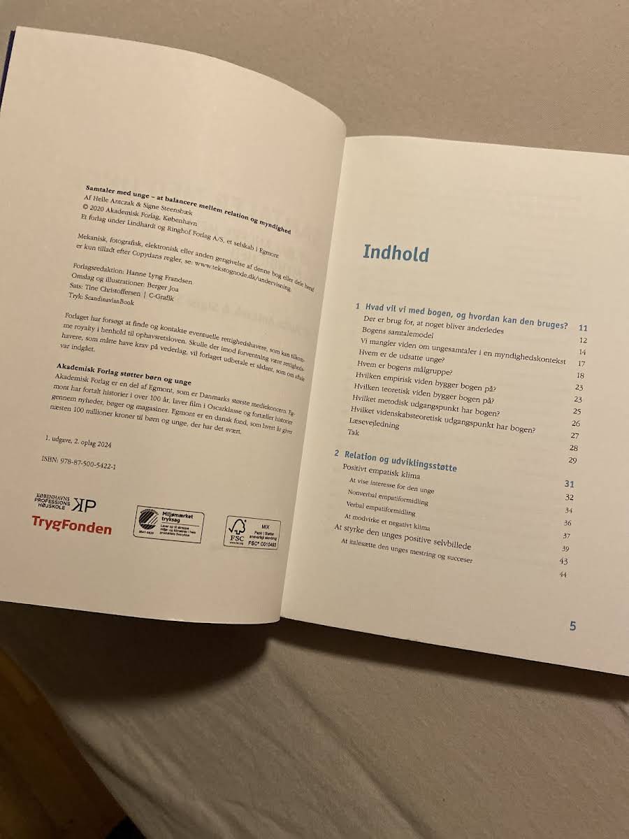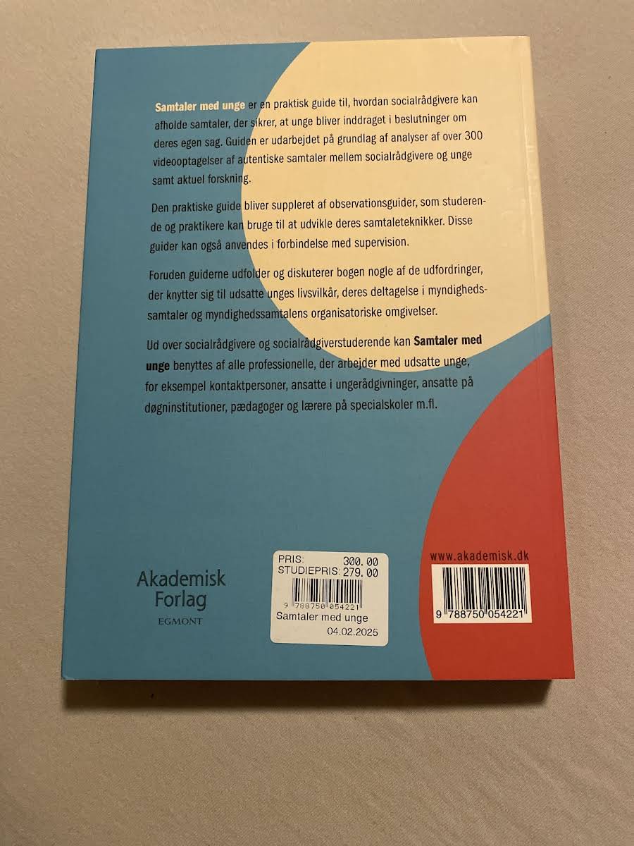 Samtaler med unge: At balancere mellem relation og myndighed er en praktisk og casesamlinget guide, der understøtter professionelle i arbejdet med at inddrage unge i beslutninger om deres egen sag. Med udgangspunkt i analyser af over 300 autentiske videooptagelser af samtaler mellem socialrådgivere og unge samt aktuel forskning, præsenterer bogen konkrete eksempler og observationsguider, der styrker samtaleteknikkerne. Bogen udfolder desuden de komplekse udfordringer, som møder udsatte unges livsvilkår, og belyser, hvordan en positiv relation kan være afgørende for samtalens udfald. Udover socialrådgivere og studerende inden for socialt arbejde, er værket relevant for alle fagpersoner, der arbejder med unge, herunder kontaktpersoner, rådgivere, pædagoger og lærere på specialskoler.