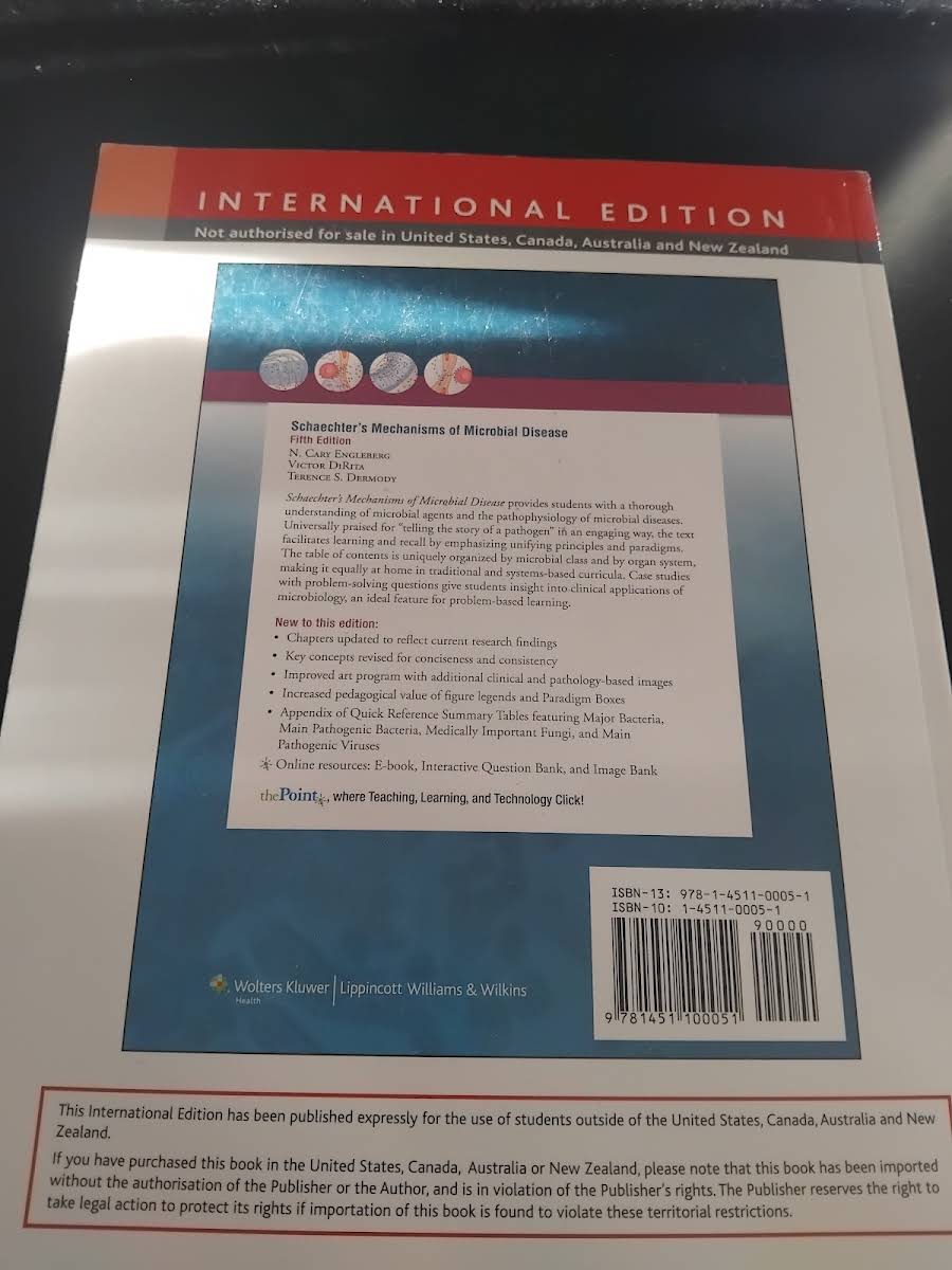 Schaechter’s Mechanisms of Microbial Disease, 5. udgave (2012), skrevet af Victor DiRita, giver de studerende en dybdegående forståelse af mikrobielle agenter og patofysiologien bag infektionssygdomme. Bogen fortæller "pathogenets historie" på en engagerende måde, så indlæring og erindring sker ved hjælp af gennemgående principper og paradigmer frem for mekanisk faktaplugning. Indholdsfortegnelsen er unikt opbygget efter både mikrobiel klassificering og organ­system, hvilket gør opslag let for både traditionelle og problemorienterede undervisningsforløb. Denne struktur sikrer, at læseren kan se sammenhænge på tværs af mikroorganismer og sygdomsmønstre. Gennem udvalgte case-studier med tilhørende problemløsningsspørgsmål får man indblik i kliniske anvendelser af mikrobiologien - ideelt til problembaseret læring. Med sine 848 sider i paperback-udgave fra Lippincott Williams & Wilkins er dette værk uundværligt for medicinstuderende og andre sundhedsprofessionelle.