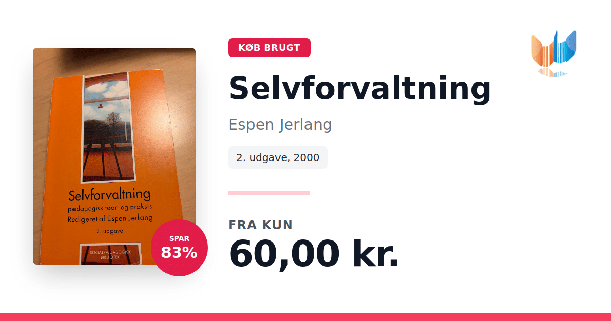 Lige nu kan du købe "Selvforvaltning" af Espen Jerlang til kun 60,00 kr. Du sparer hele 83% af nyprisen! Bogen du ser her er brugt, og i slidt stand. Vi har i øjeblikket 2 eksemplarer til salg af "Selvforvaltning", så husk at se de forskellige udgaver.