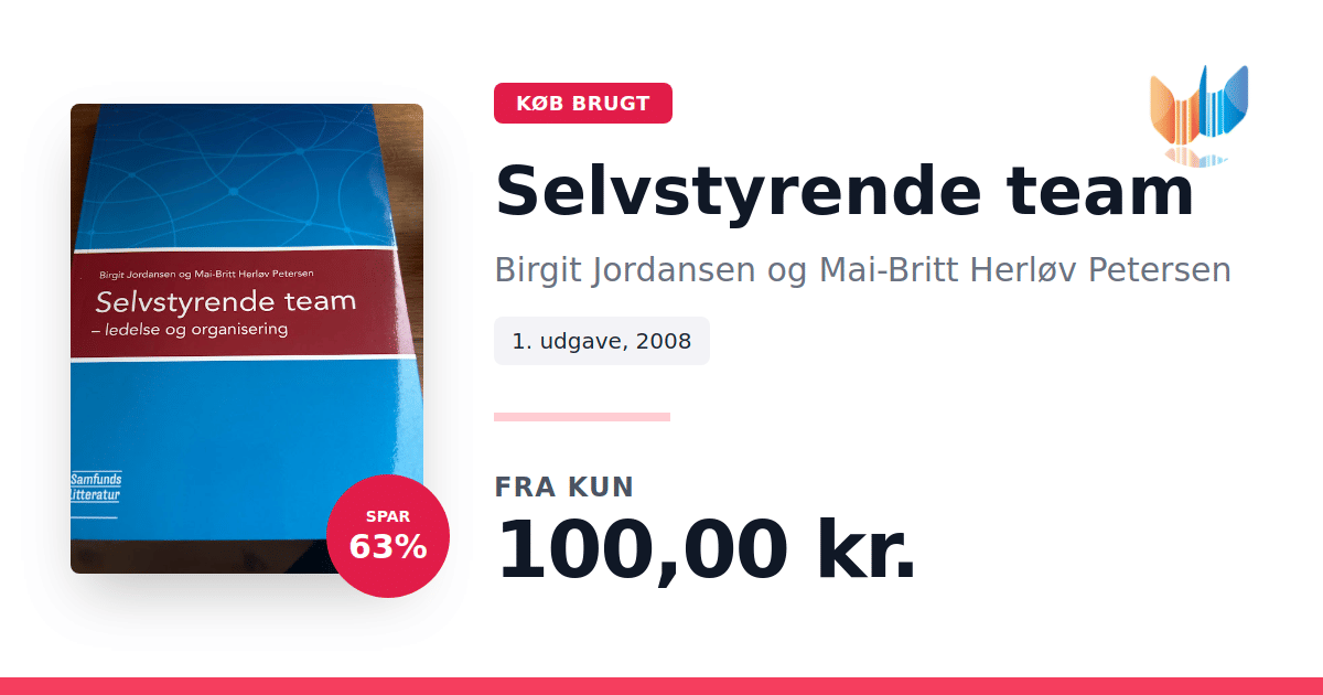 Lige nu kan du købe "Selvstyrende team" af Birgit Jordansen og Mai-Britt Herløv Petersen til kun 100,00 kr. Du sparer hele 63% af nyprisen! Bogen du ser her er brugt, og i perfekt stand. Vi har i øjeblikket 3 eksemplarer til salg af "Selvstyrende team", så husk at se de forskellige udgaver.
