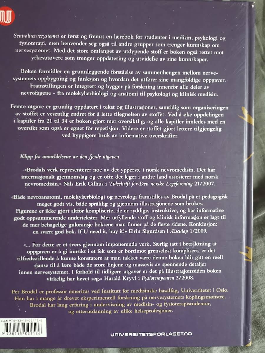 Sentralnervesystemet (5. utg.) gir en helhetlig innføring i hvordan nervesystemets struktur henger sammen med dets mangfoldige funksjoner. Boken bygger på solid forskning innen alle relevante nevrofag, fra molekylærbiologi og anatomi til psykologi og klinisk medisin, og formidler et integrert syn på feltet. I denne femte utgaven er både innhold og illustrasjoner oppdatert, samtidig som bokens struktur er revidert for å gjøre stoffet mer tilgjengelig. Med en økning fra 21 til 34 kapitler, introduseres nye oversikter ved starten av hvert kapittel for å forenkle repetisjon og videre forståelse. Klar inndeling og informative overskrifter bidrar ytterligere til en forbedret leseropplevelse.