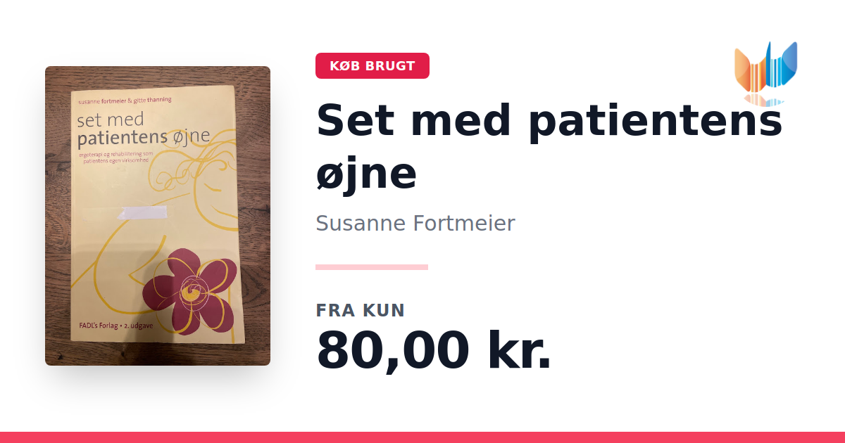 Lige nu kan du købe "Set med patientens øjne" af Susanne Fortmeier til kun 80,00 kr. Bogen du ser her er brugt, og i perfekt stand. Vi har i øjeblikket kun et enkelt eksemplar til salg af "Set med patientens øjne", så slå til mens du kan!