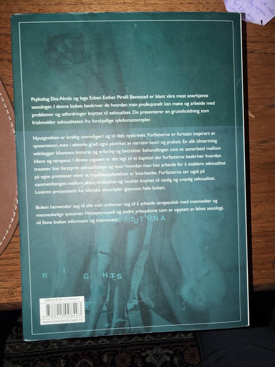 "Sexologi i praksis: behandleres møte med menneskers seksualitet (2.utg.)" er en dyptgående og allsidig lærebok som gir et solidt grunnlag for forståelsen av menneskelig seksualitet i terapeutisk arbeid. Boken presenterer et bredt spekter av tilnærminger til hvordan profesjonelle kan møte og bearbeide seksuelle utfordringer hos sine klienter. Med inspirasjon fra både systemteori og narrativ terapi, utforsker forfatterne Elsa Almås og Esben Esther Pirelli Benestad de komplekse relasjonene i terapeutens arbeid med seksualitet. I denne andre utgaven er et nytt kapittel lagt til, der temaer som traumer og deres innvirkning på seksualiteten blir grundig belyst, og strategier for gjenoppretting etter traumatiske opplevelser presenteres på en praksisnær måte.
