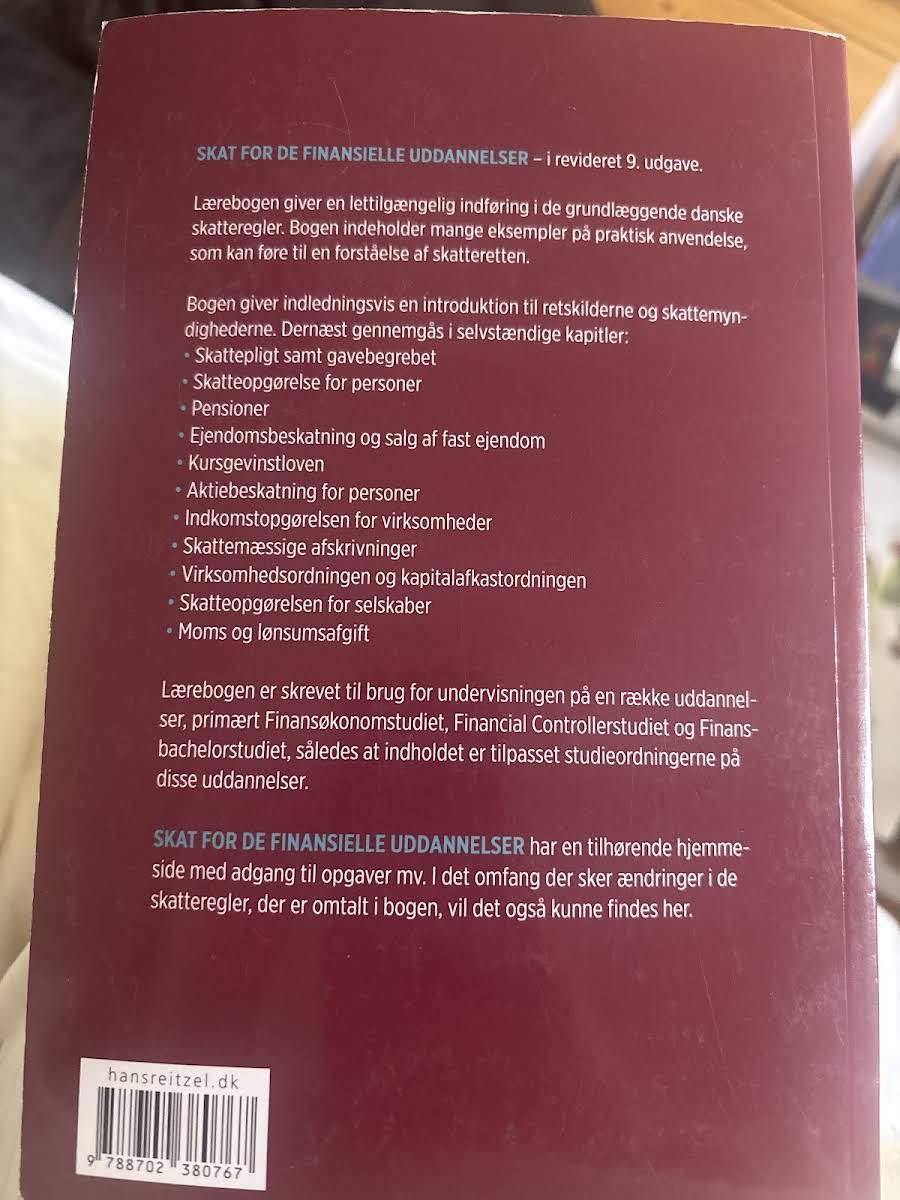Lærebogens 9. udgave er opdateret med de nyeste ændringer i lovgivningen og præsenterer en overskuelig introduktion til de centrale danske skatteregler. Bogen er designet med henblik på undervisningen på flere finansielle uddannelser, herunder Finansøkonomstudiet, Financial Controller-studiet og Finansbachelorstudiet. Bogen starter med en grundig gennemgang af retskilder og de skattemyndigheder, som spiller en central rolle i skatteretten. Herefter uddybes emner som skattepligt, opgørelse af skat samt ejendomsbeskatning og salg af fast ejendom. Læseren får desuden indblik i kursgevinstloven og aktiebeskatning. Endvidere behandler bogen indkomstopgørelsen for virksomheder, skattemæssige afskrivninger, virksomhedsordningen og kapitalafkastordningen. Der gives også en klar introduktion til pensioner, moms og lønsumsafgift med mange praktiske eksempler, der gør det lettere at forstå og anvende skatteretlige principper i praksis.