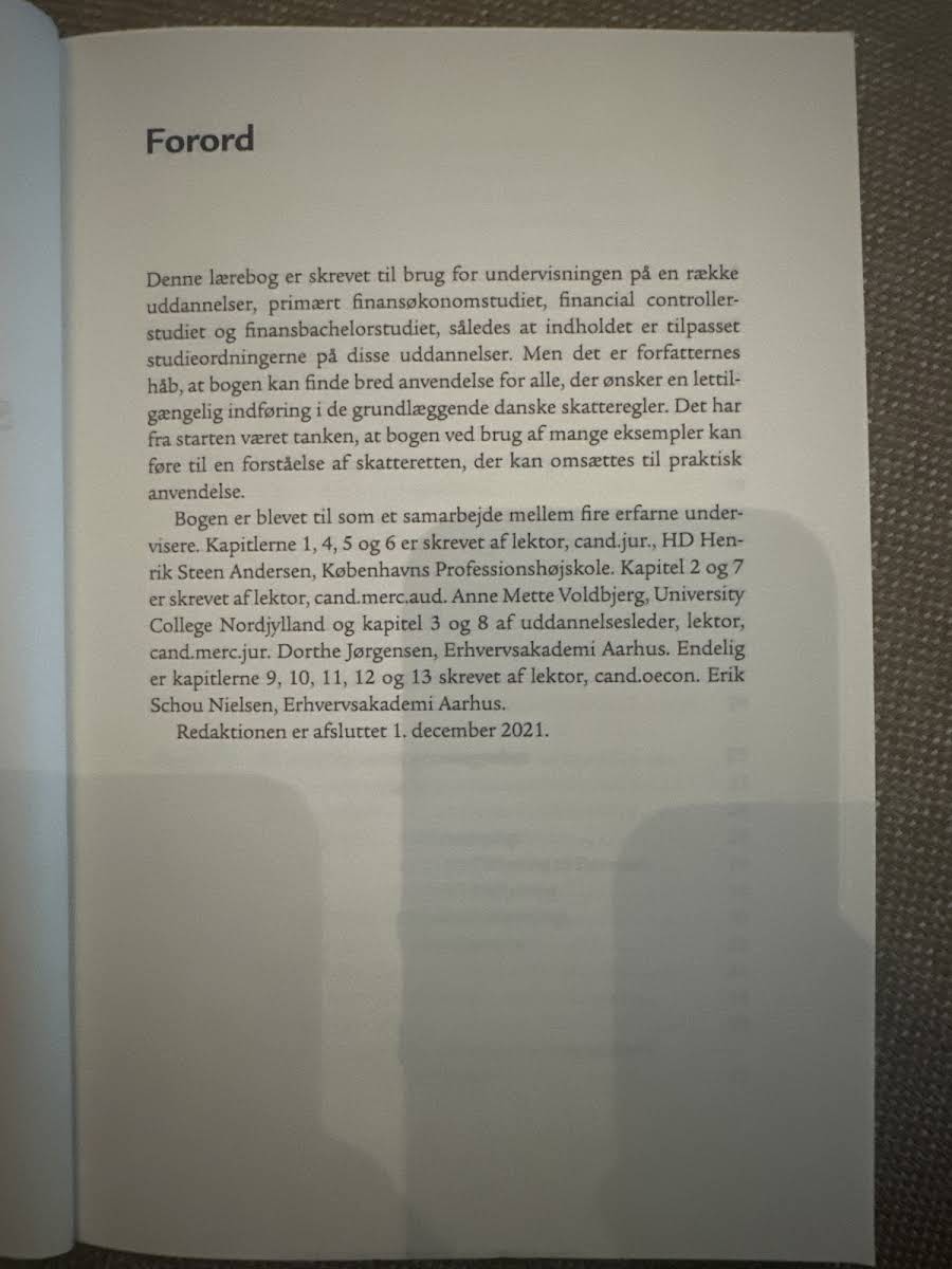 Skat for de finansielle uddannelser foreligger nu i en revideret 8. udgave, opdateret med de nyeste lovændringer. Lærebogen giver en overskuelig og praktisk indføring i de grundlæggende danske skatteregler, skrevet af Henrik Steen Andersen, Dorthe Jørgensen, Erik Schou Nielsen og Anne Mette Voldbjerg. Bogen er spækket med illustrative eksempler på praktisk anvendelse, der sikrer læseren en solid forståelse af skatterettens komplekse problemstillinger. Hver gennemgang er underbygget af cases og øvelser, som målrettet træner den studerendes evne til at anvende reglerne i praksis. Indledningsvis præsenteres retskilderne og skattemyndighedernes rolle. Herefter behandles skattepligt og -opgørelse, ejendomsbeskatning og salg af fast ejendom samt reglerne i kursgevinstloven og aktiebeskatning. Derudover beskrives indkomstopgørelse for virksomheder, skattemæssige afskrivninger, virksomhedsordningen og kapitalafkastordningen samt pension, moms og lønsumsafgift. Lærebogen er særligt tilpasset undervisningen på Finansøkonomstudiet, Financial Controller-studiet og Finansbachelorstudiet, men kan også anvendes af alle, der ønsker en praktisk og grundig indføring i dansk skatteret.