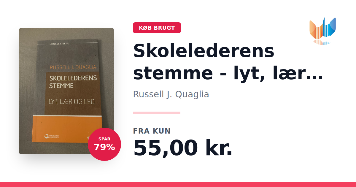 Lige nu kan du købe "Skolelederens stemme - lyt, lær og led" af Russell J. Quaglia til kun 55,00 kr. Du sparer hele 79% af nyprisen! Bogen du ser her er brugt, og i god stand. Vi har i øjeblikket kun et enkelt eksemplar til salg af "Skolelederens stemme - lyt, lær og led", så slå til mens du kan!