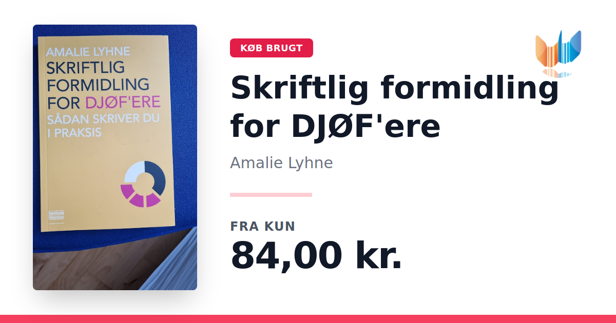 Lige nu kan du købe "Skriftlig formidling for DJØF'ere" af Amalie Lyhne til kun 84,00 kr. Bogen du ser her er brugt, og i perfekt stand. Vi har i øjeblikket kun et enkelt eksemplar til salg af "Skriftlig formidling for DJØF'ere", så slå til mens du kan!