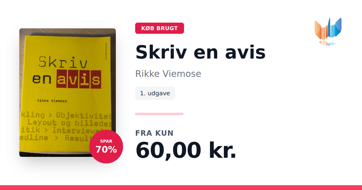 Lige nu kan du købe "Skriv en avis" af Rikke Viemose til kun 60,00 kr. Du sparer hele 70% af nyprisen! Bogen du ser her er brugt, og i perfekt stand. Vi har i øjeblikket 3 eksemplarer til salg af "Skriv en avis", så husk at se de forskellige udgaver.