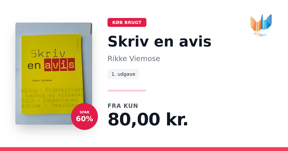 Lige nu kan du købe "Skriv en avis" af Rikke Viemose til kun 80,00 kr. Du sparer hele 60% af nyprisen! Bogen du ser her er brugt, og i perfekt stand. Vi har i øjeblikket 3 eksemplarer til salg af "Skriv en avis", så husk at se de forskellige udgaver.